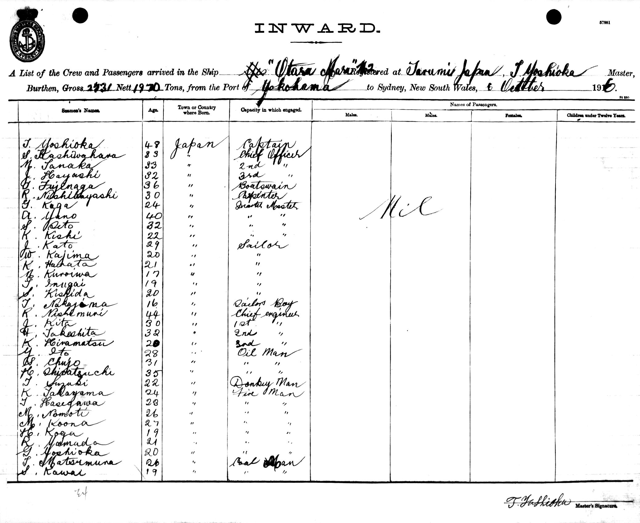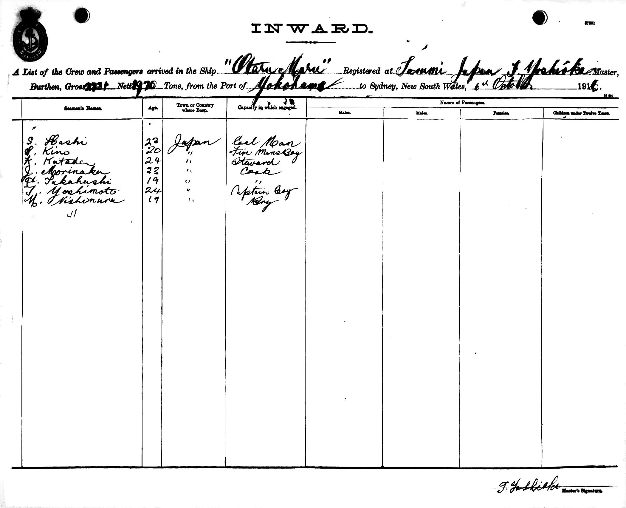 OTARU MARU NO. 2OF TARUMI, JAPAN, T. YOSHIOKA, MASTER, BURTHEN 2731/1970 TONS FROM THE PORT OF YOKOHAMA TO SYDNEY, NEW SOUTH WALES, 6TH OCTOBER 1916 |