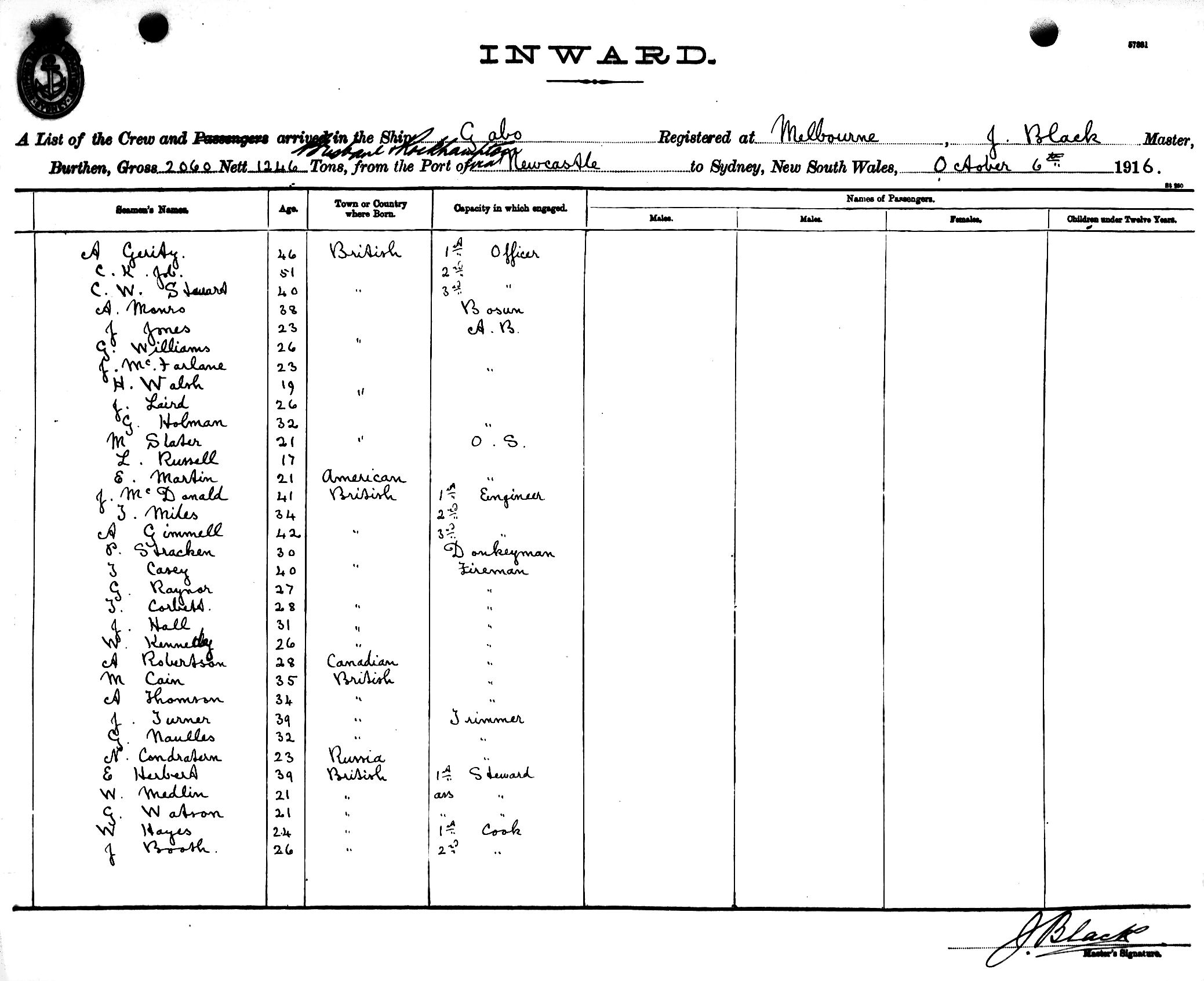GABOOF MELBOURNE, J. BLACK, MASTER, BURTHEN 2060/1246 TONS FROM THE PORT OF ROCKHAMPTON & BRISBANE via NEWCASTLE TO SYDNEY, NEW SOUTH WALES, 6TH OCTOBER 1916 |