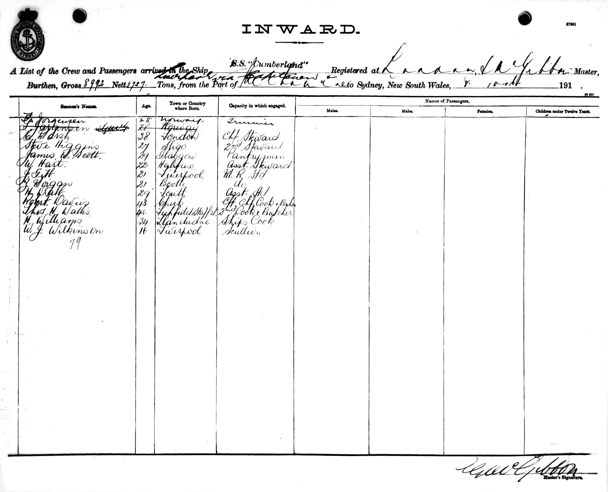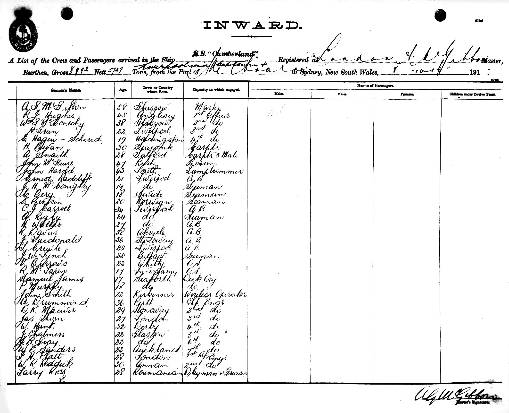 CUMBERLANDOF LONDON, A. G. MCGIBBON, MASTER, BURTHEN 8992/5727 TONS FROM THE PORT OF LIVERPOOL via CAPE TOWN & MELBOURNE TO SYDNEY, NEW SOUTH WALES, 8TH OCTOBER 1916 |