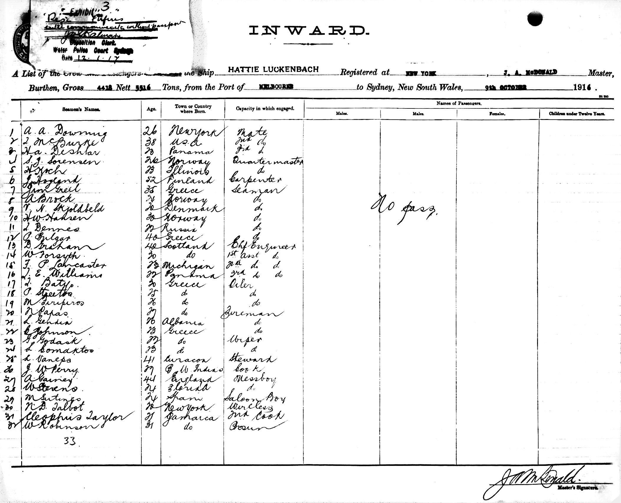 HATTIE LUCKENBACHOF NEW YORK, J. A. MCDONALD, MASTER, BURTHEN 4418/3316 TONS FROM THE PORT OF MELBOURNE TO SYDNEY, NEW SOUTH WALES, 9TH OCTOBER 1916 |