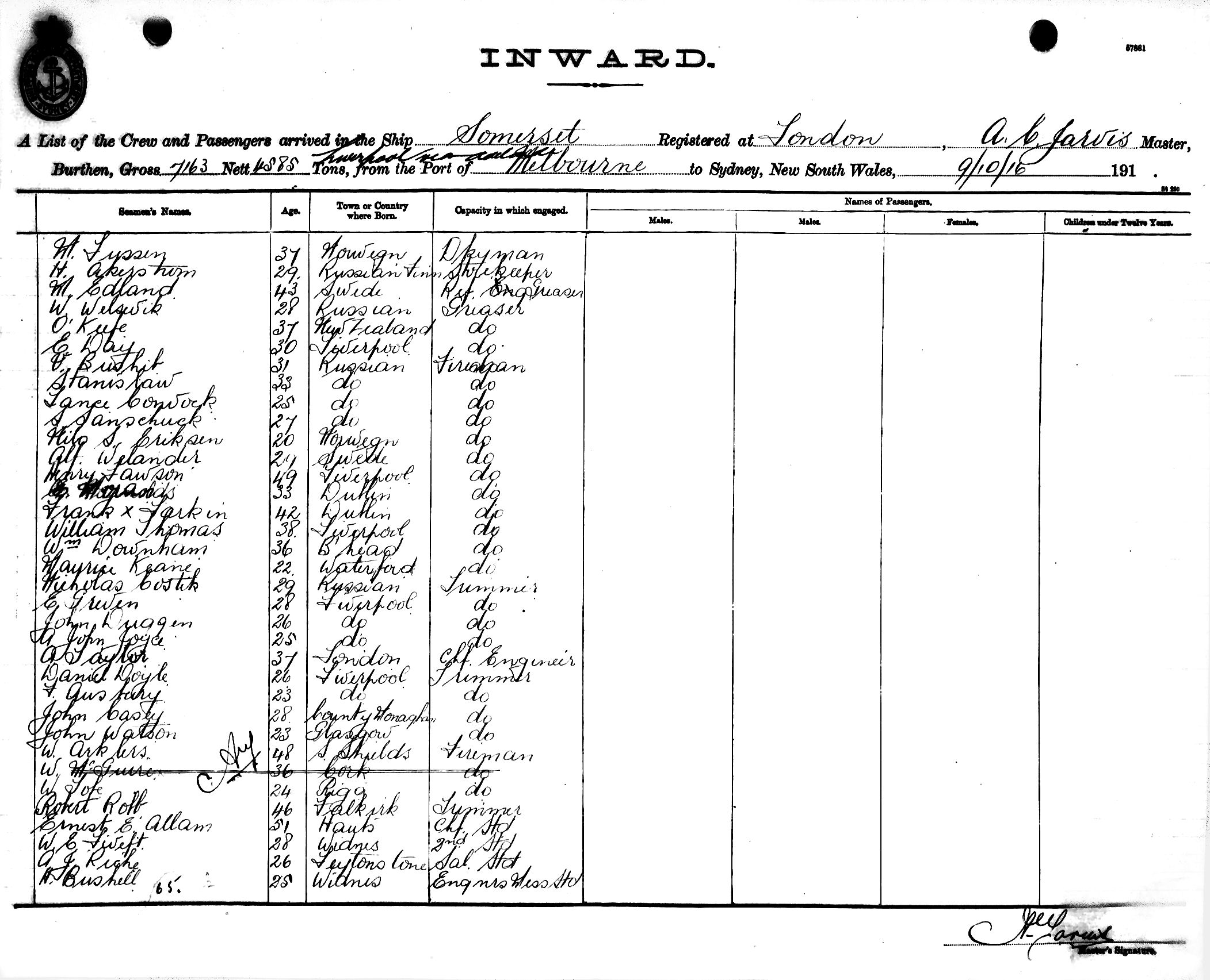 Mariners and ships in Australian Waters | SOMERSETOF LONDON, A. C. JARVIS, MASTER, BURTHEN 7163/4585 TONS FROM THE PORT OF LIVERPOOL via ADELAIDE & MELBOURNE TO SYDNEY, NEW SOUTH WALES, 9TH OCTOBER 1916 |