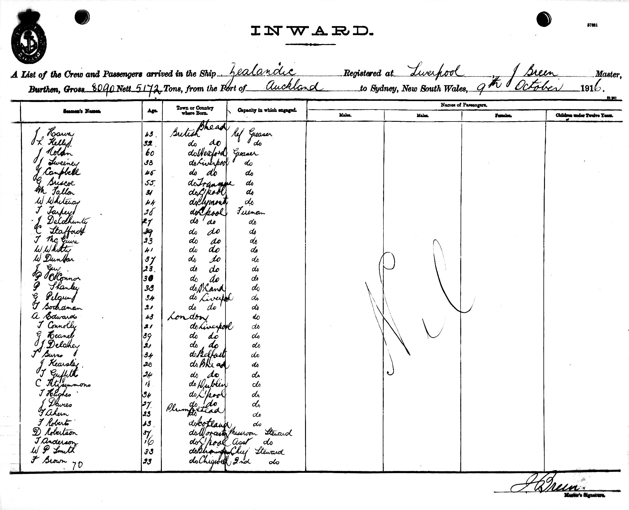 ZEALANDICOF LIVERPOOL, J. BREEN, MASTER, BURTHEN 8090/5172 TONS FROM THE PORT OF AUCKLAND TO SYDNEY, NEW SOUTH WALES, 9TH OCTOBER 1916 |