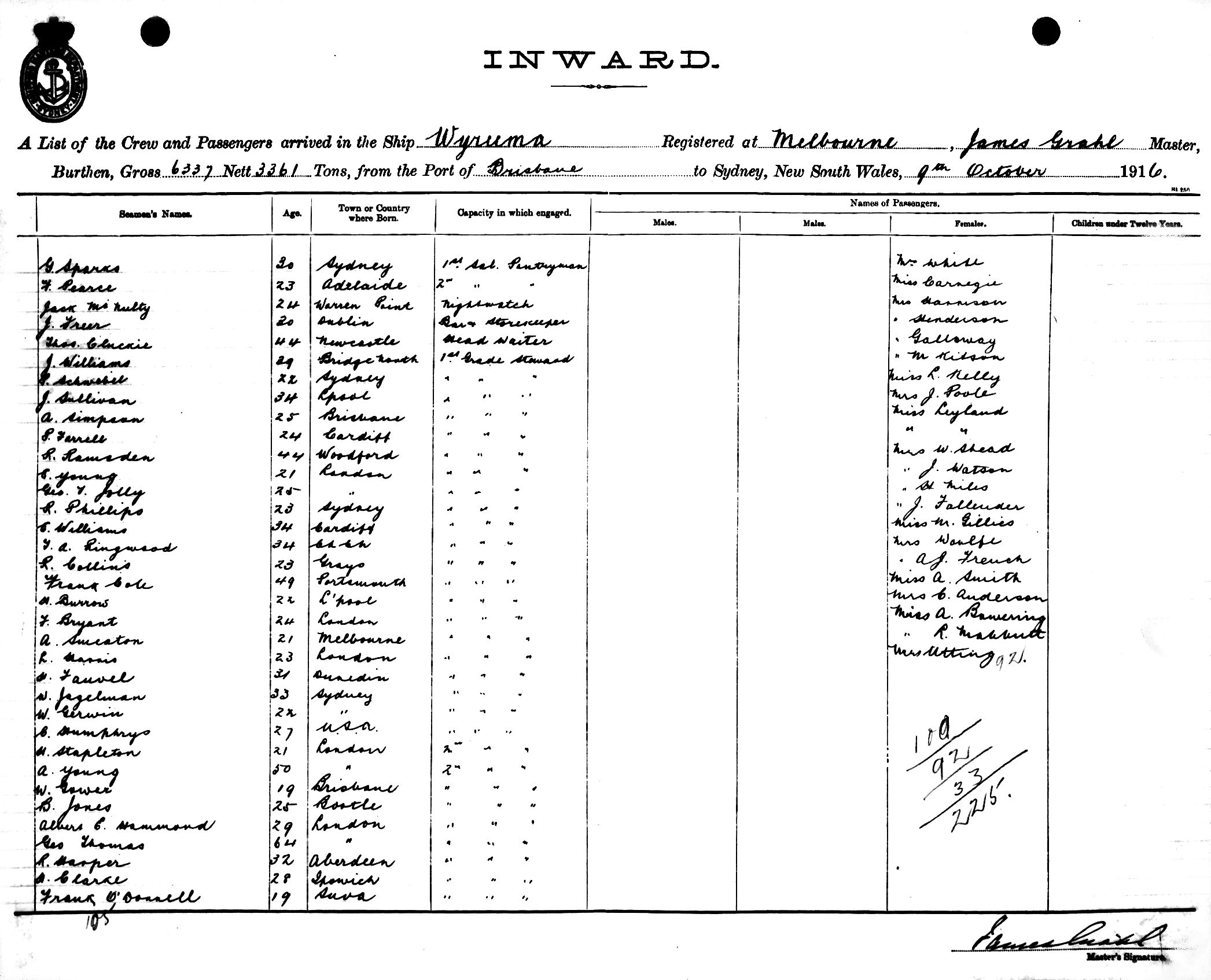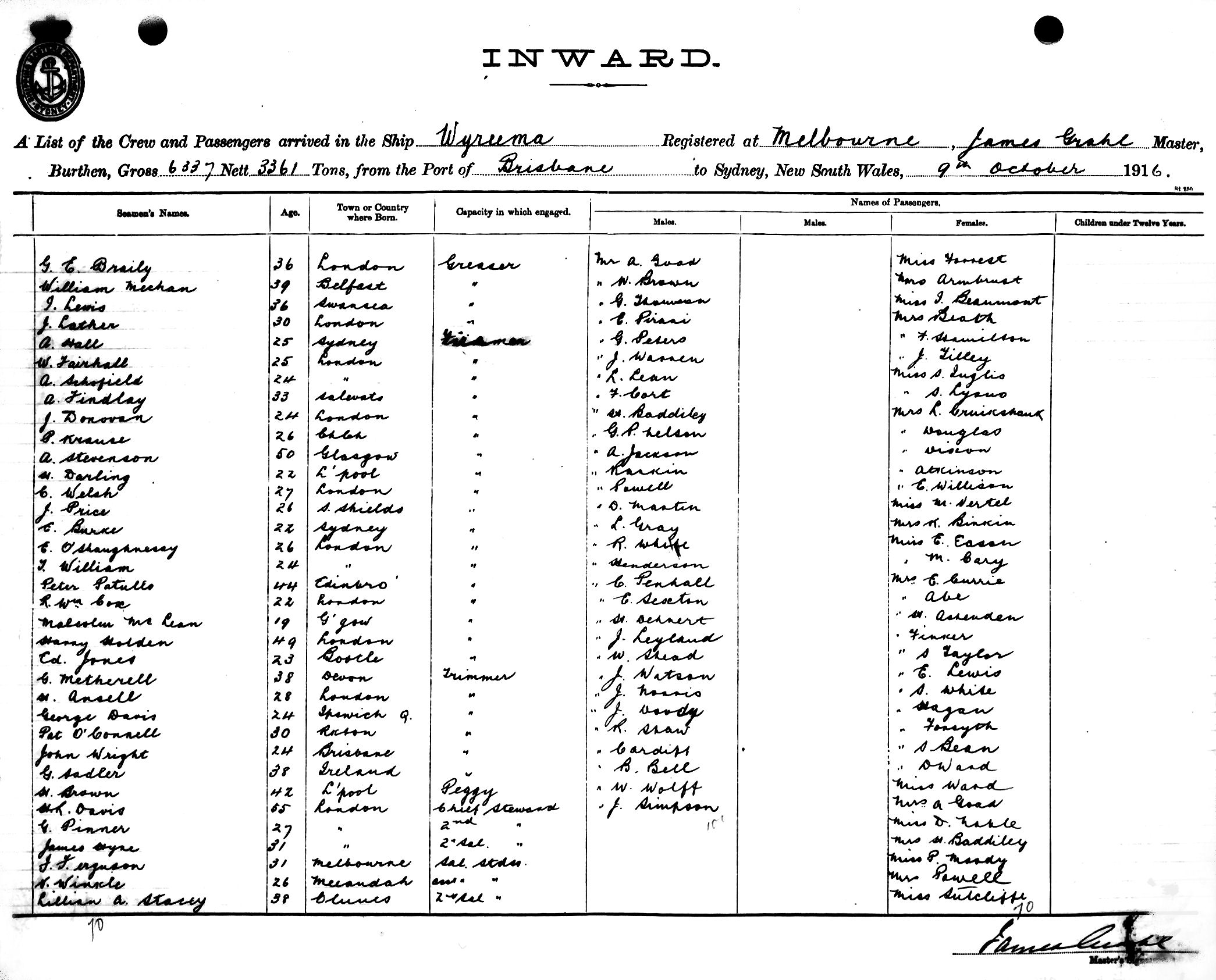 Mariners and ships in Australian Waters | WYREEMAOF MELBOURNE, JAMES GRAHL, MASTER, BURTHEN 6337/3361 TONS FROM THE PORT OF BRISBANE TO SYDNEY, NEW SOUTH WALES, 9TH OCTOBER 1916 |