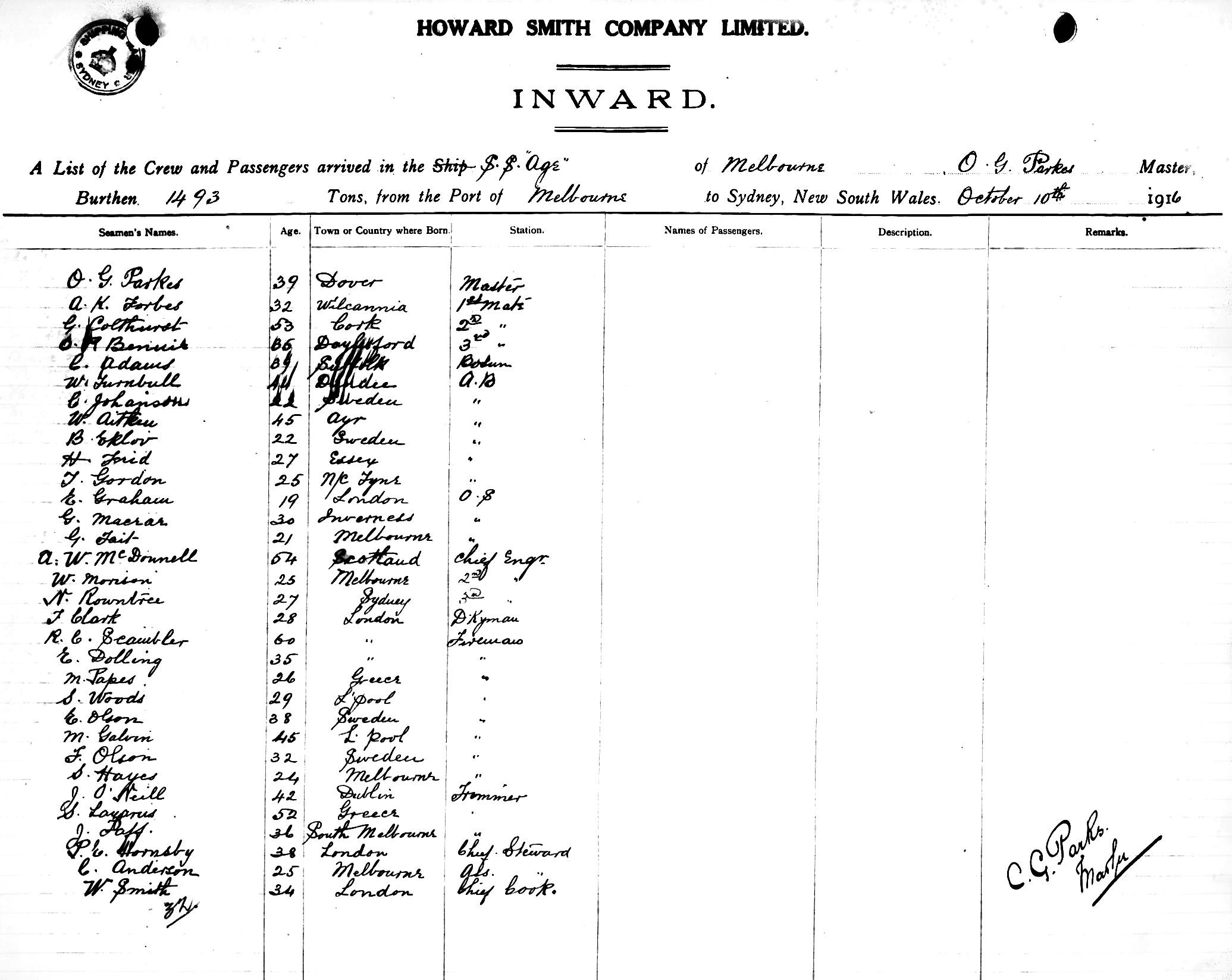 AGEOF MELBOURNE, O. G. PARKES, MASTER, BURTHEN 1493 TONS FROM THE PORT OF MELBOURNE TO SYDNEY, NEW SOUTH WALES, 10TH OCTOBER 1916 |