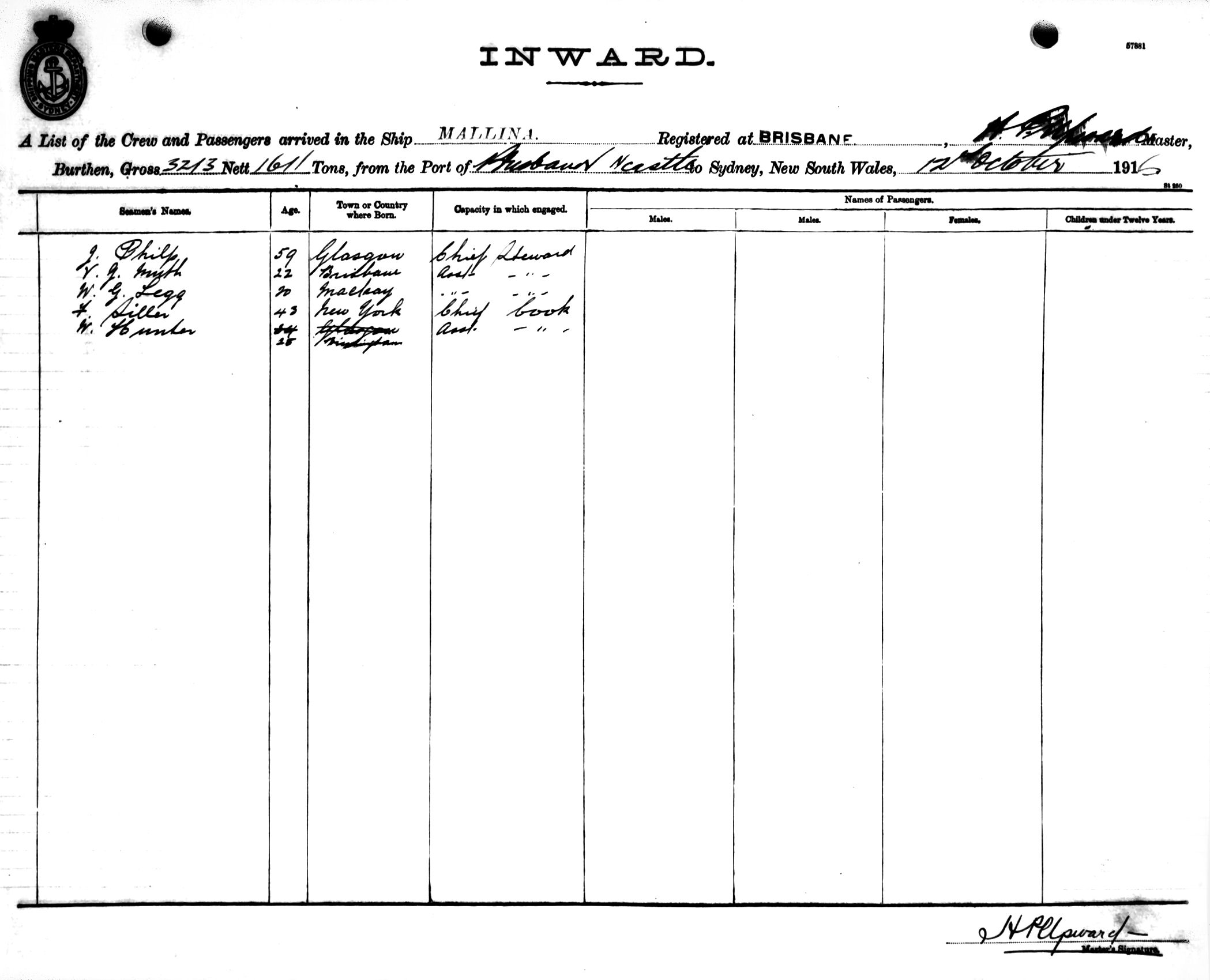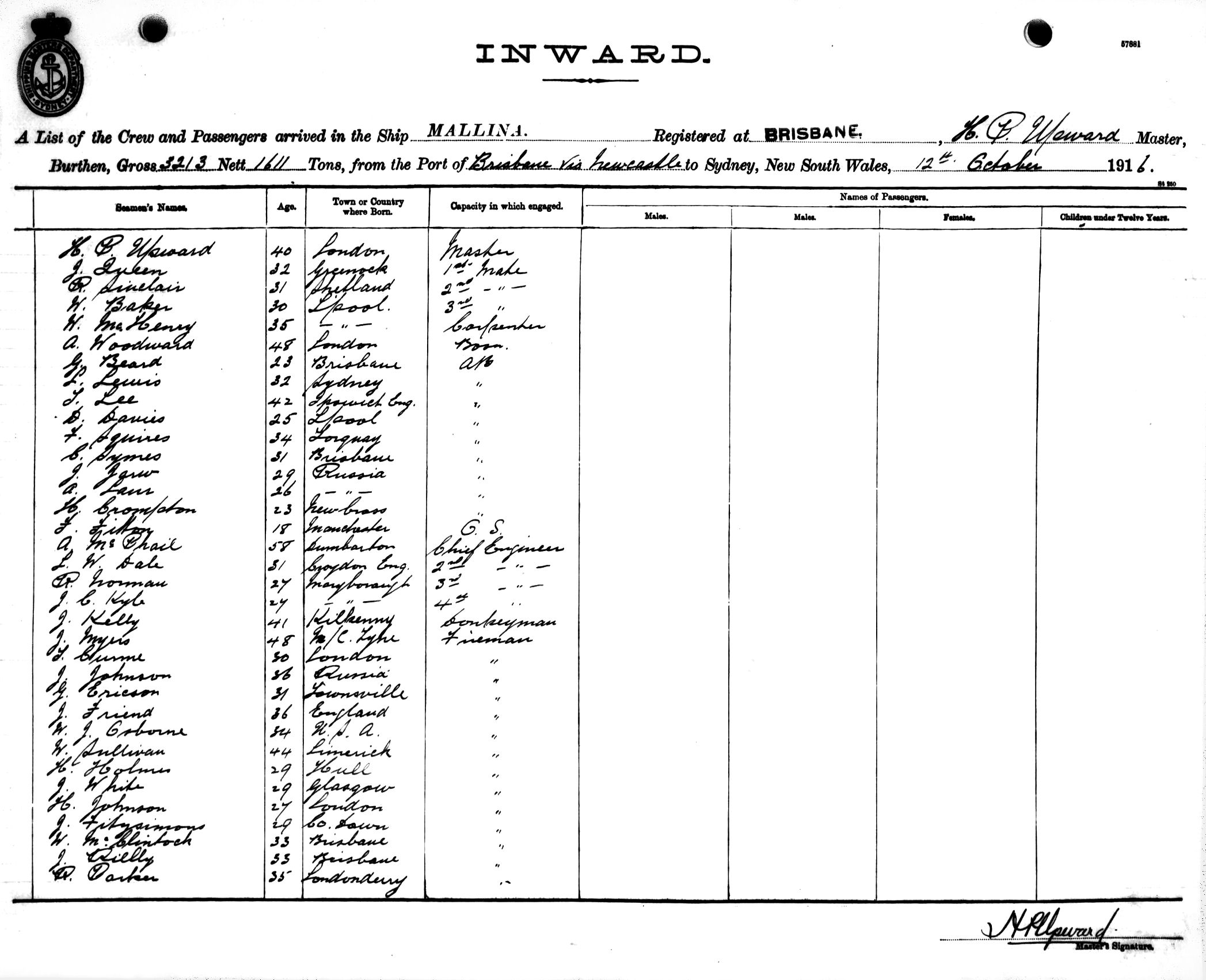 Mariners and ships in Australian Waters | MALLINAOF BRISBANE, H. C. UPWARD, MASTER, BURTHEN 323/1611 TONS FROM THE PORT OF BRISBANE via NEWCASTLE TO SYDNEY, NEW SOUTH WALES, 12TH OCTOBER 1916 |