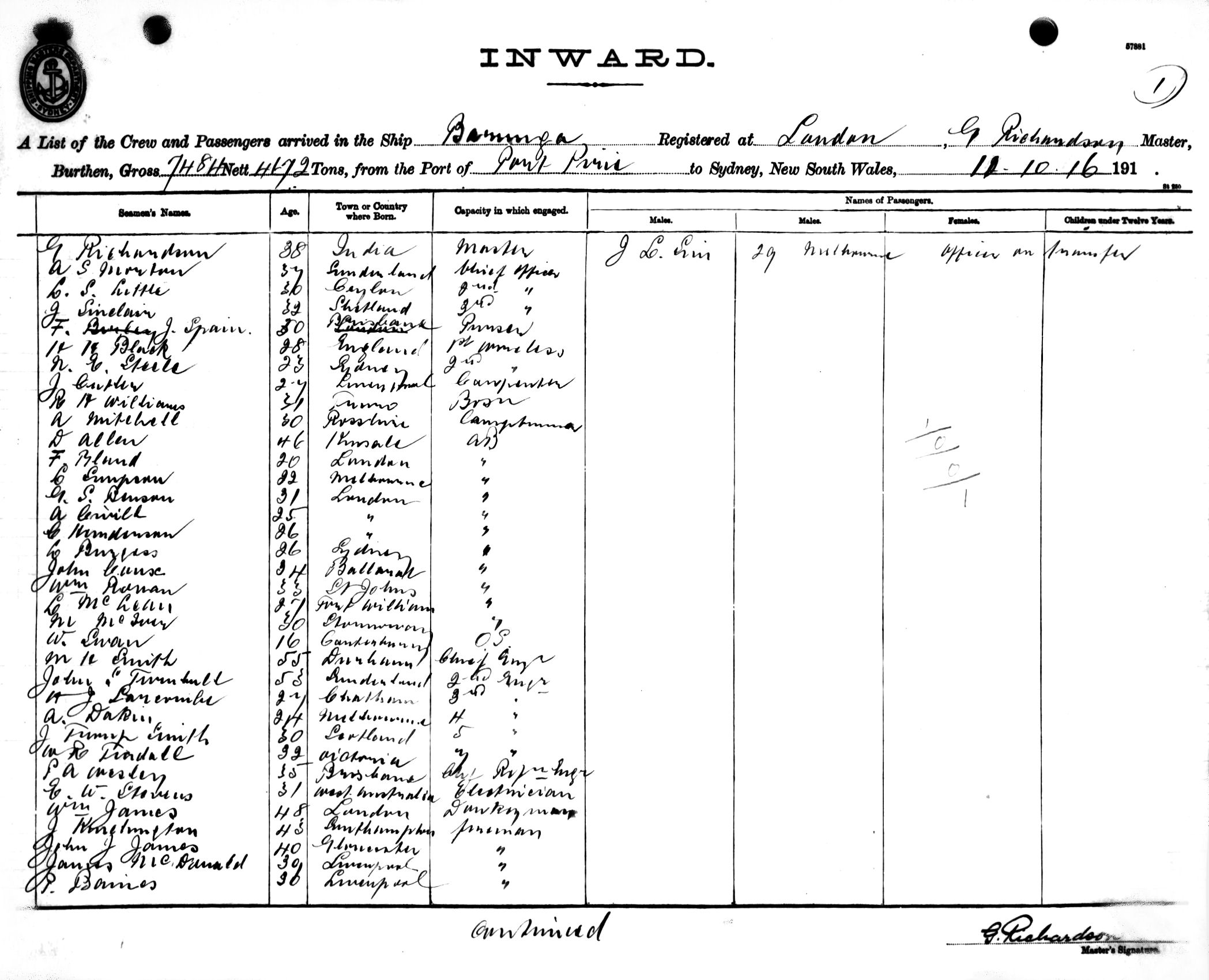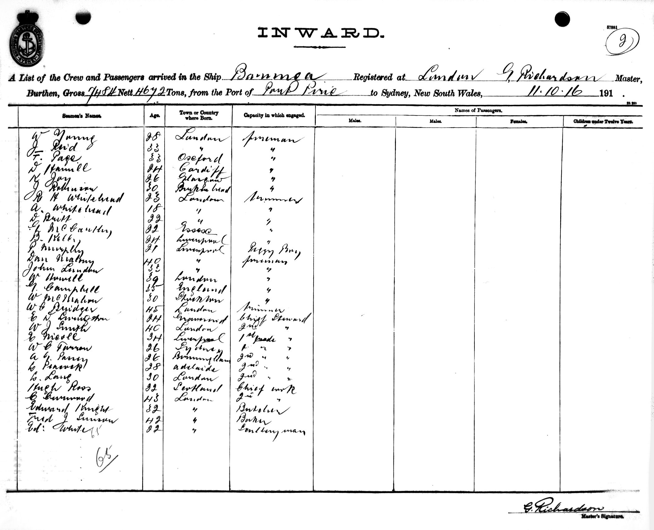 BARUNGAOF LONDON, G. RICHARDSON, MASTER, BURTHEN 7484/4672TONS FROM THE PORT OF PORT PIRIE TO SYDNEY, NEW SOUTH WALES, 11TH OCTOBER 1916 |