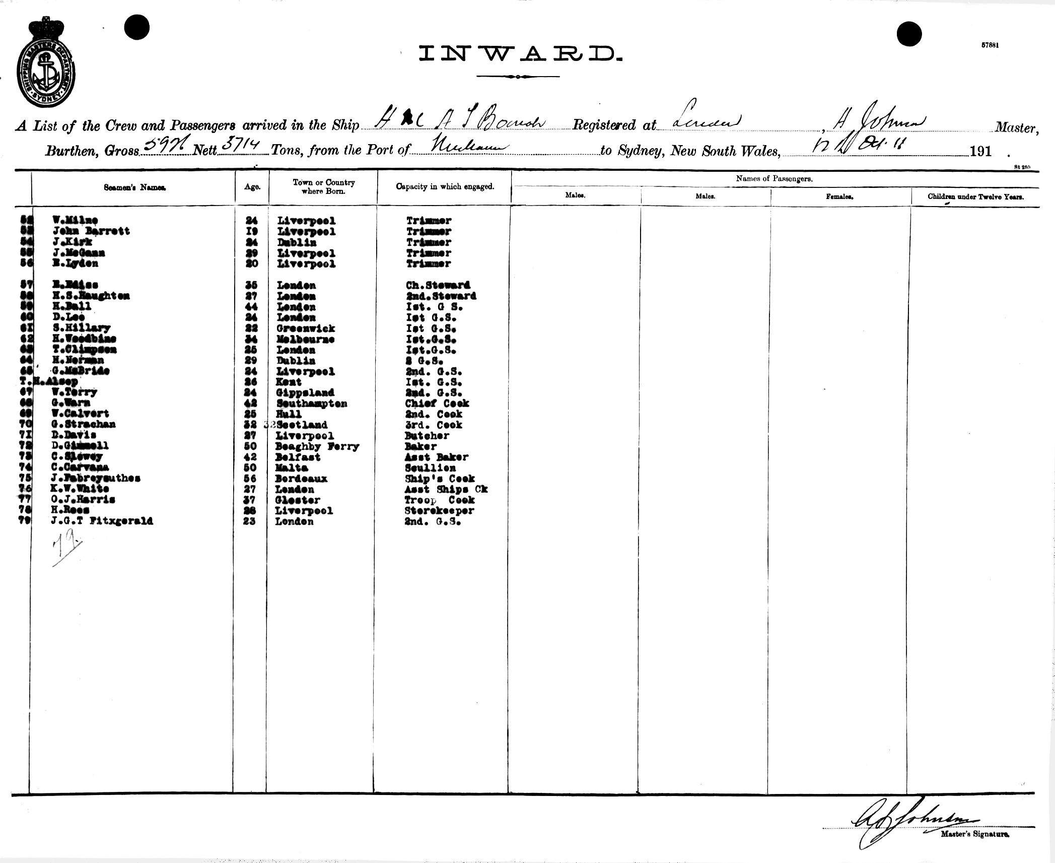 BOONAHOF LONDON, A. S. JOHNSON, MASTER, BURTHEN 5926/3714 TONS FROM THE PORT OF MELBOURNE TO SYDNEY, NEW SOUTH WALES, 12TH OCTOBER 1916 |
