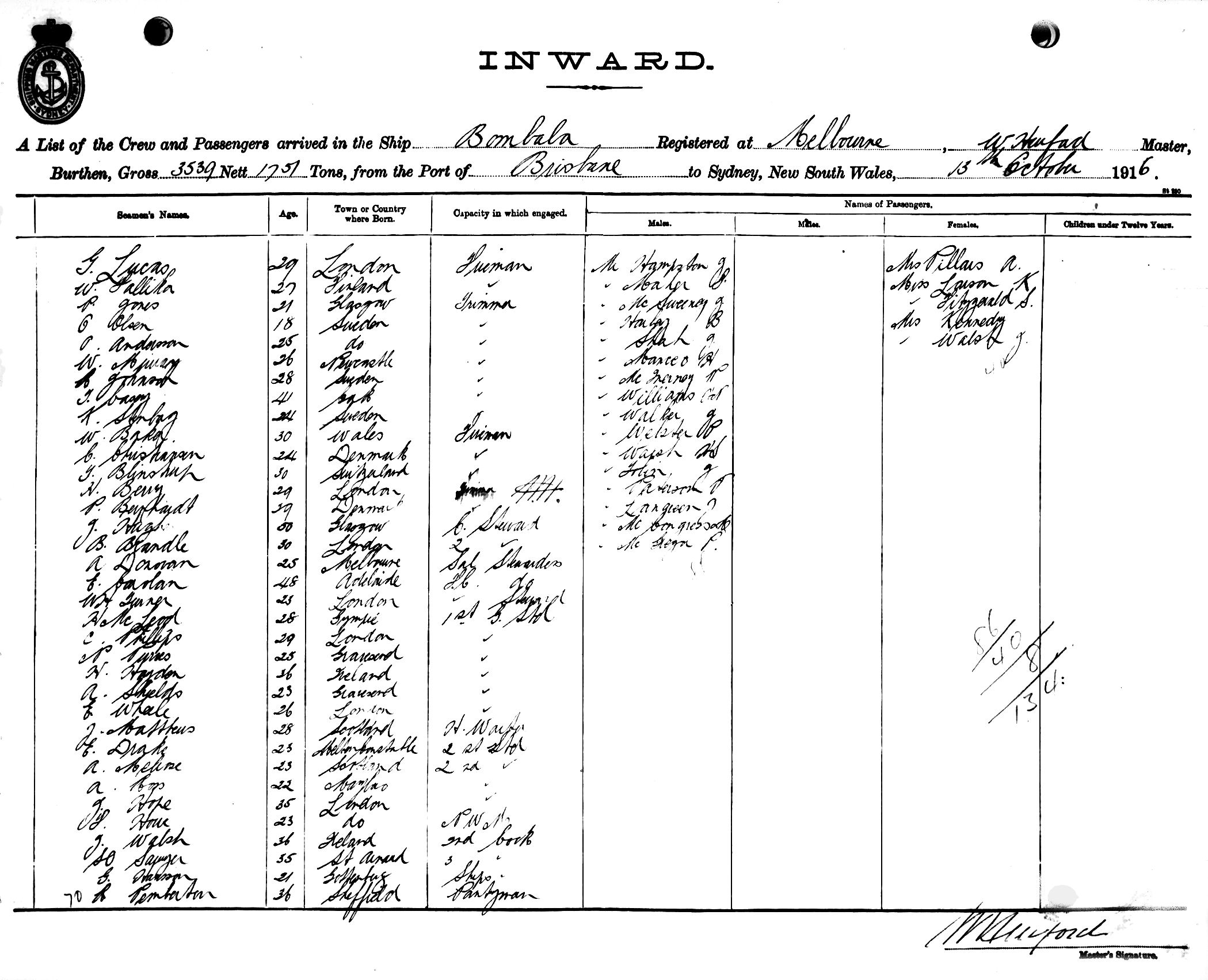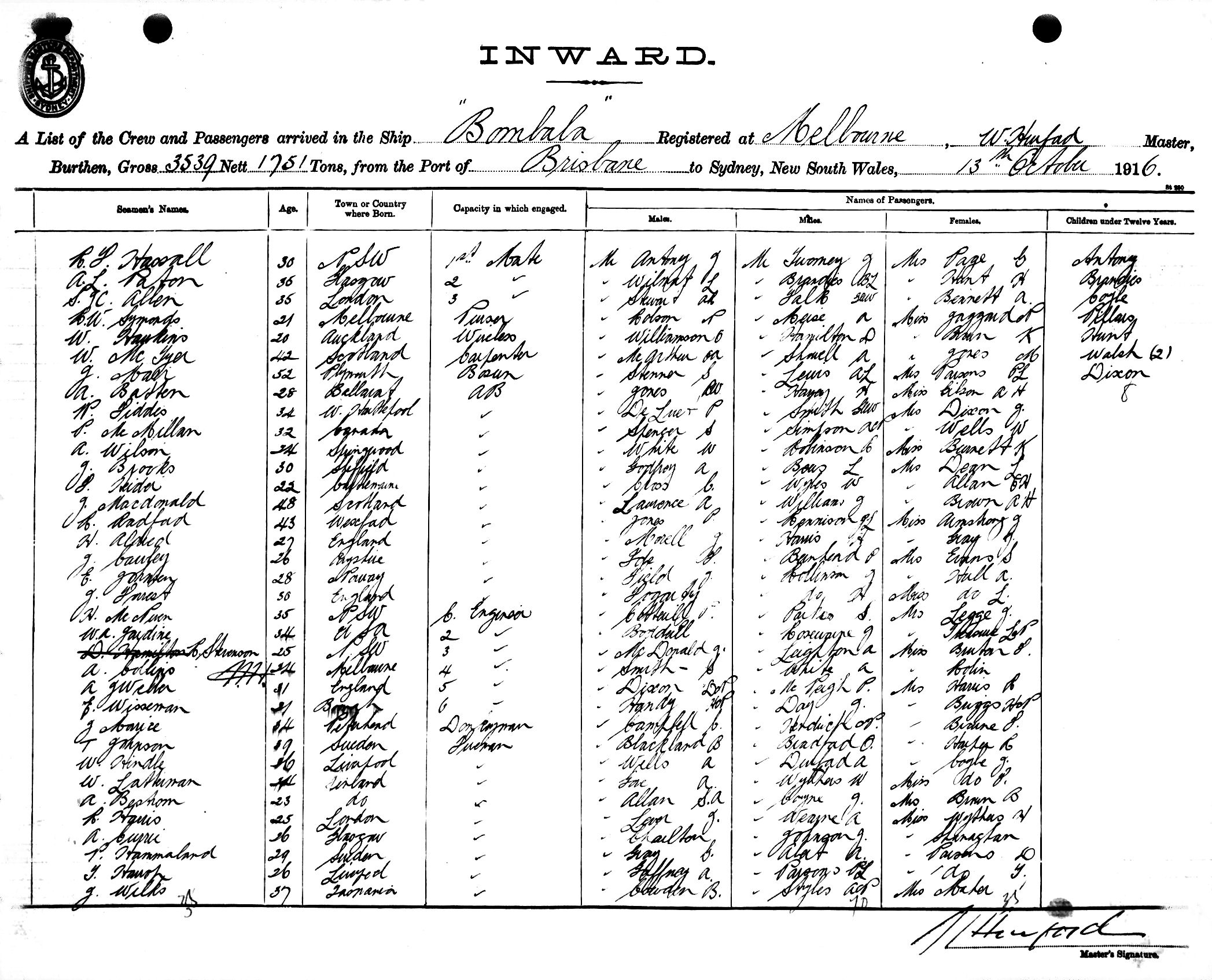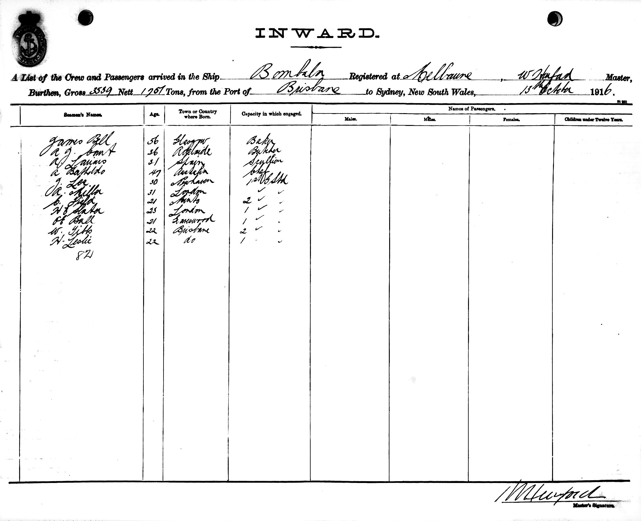 BOMBALAOF MELBOURNE, W. HURFORD, MASTER, BURTHEN 3539/1751 TONS FROM THE PORT OF BRISBANE TO SYDNEY, NEW SOUTH WALES, 13TH OCTOBER 1916 |