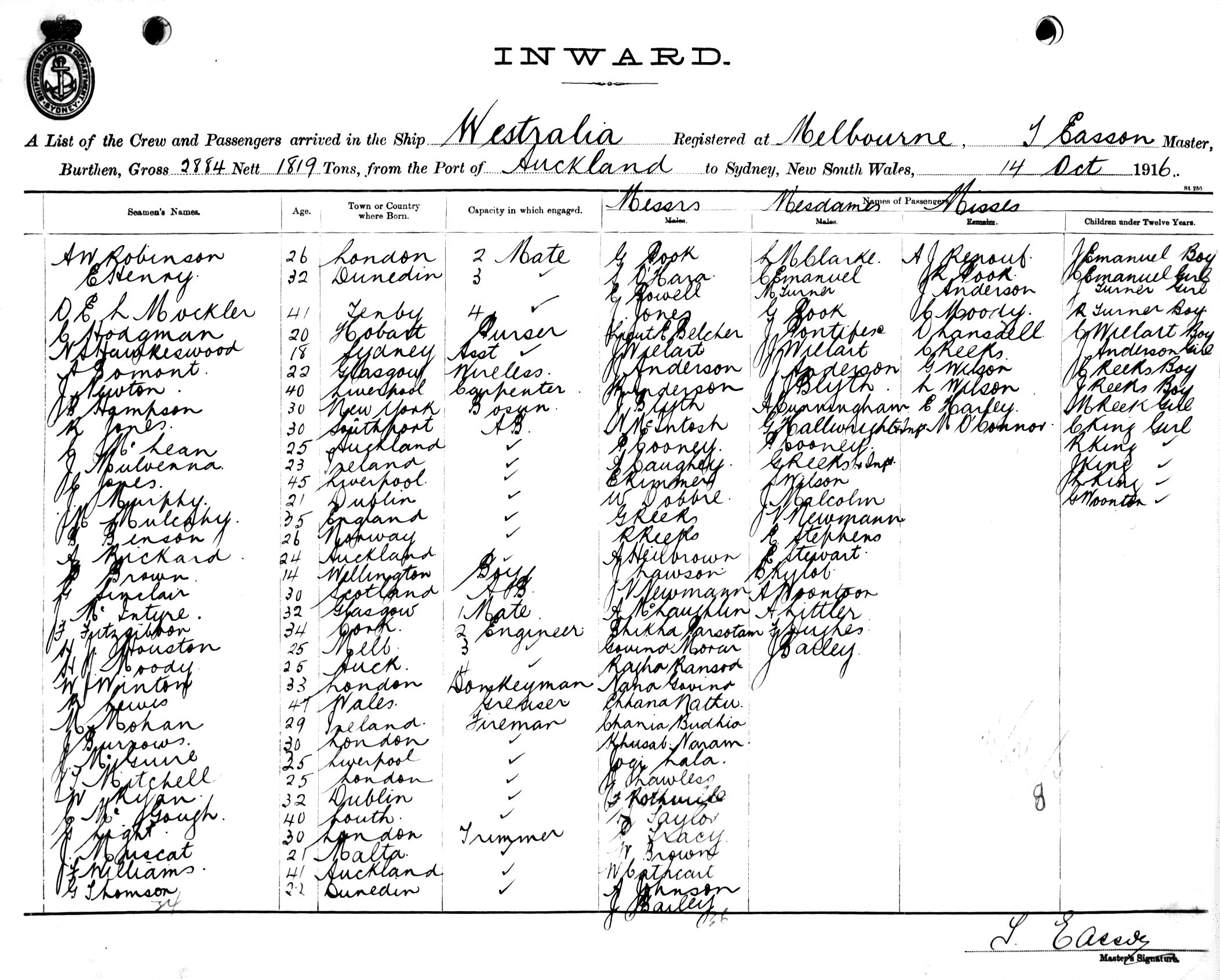 WESTRALIAOF MELBOURNE, T. EASSON, MASTER, BURTHEN 2884/1819 TONS FROM THE PORT OF AUCKLAND TO SYDNEY, NEW SOUTH WALES, 14TH OCTOBER 1916 |