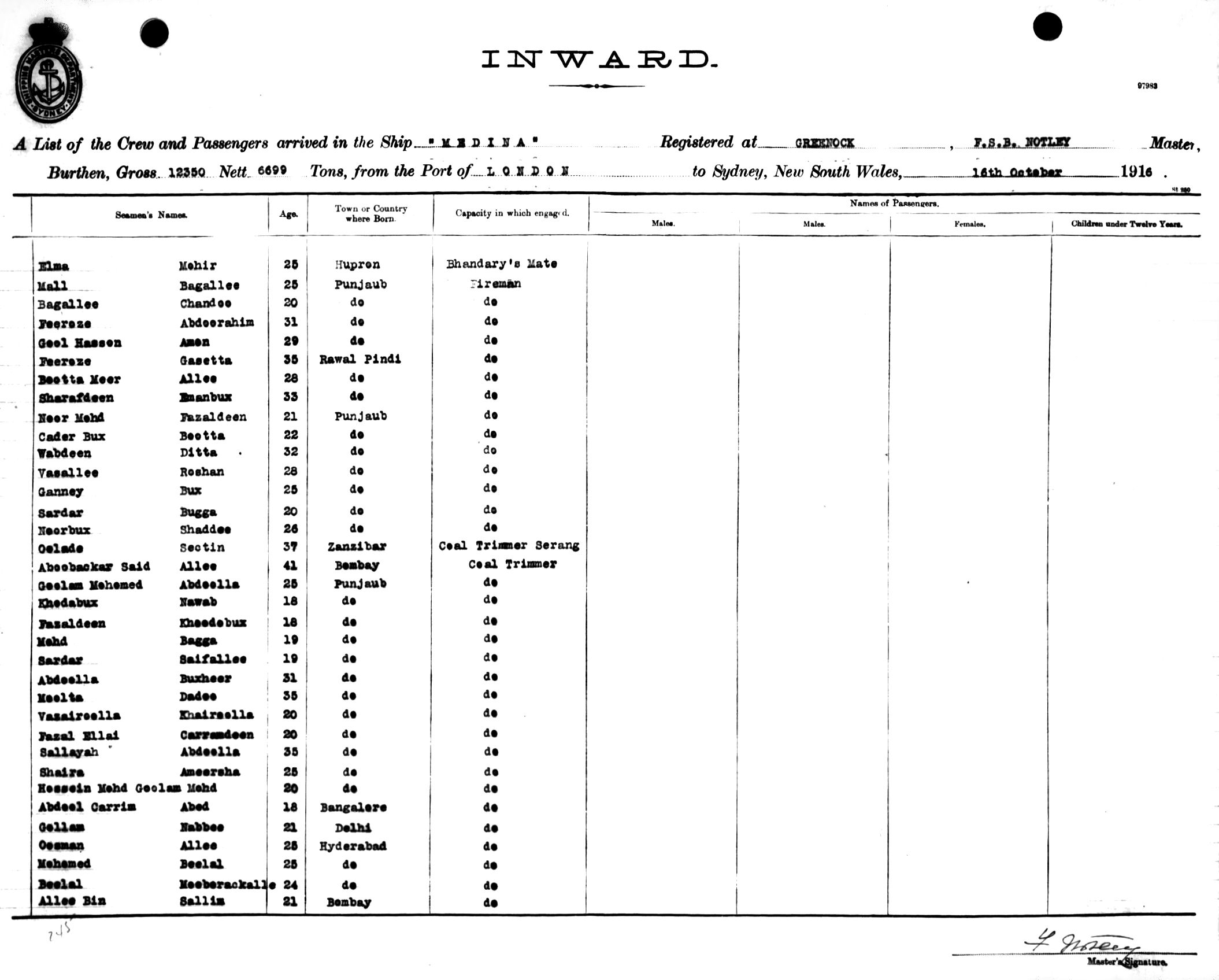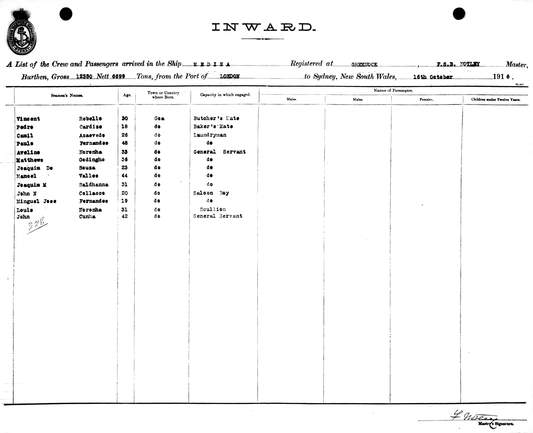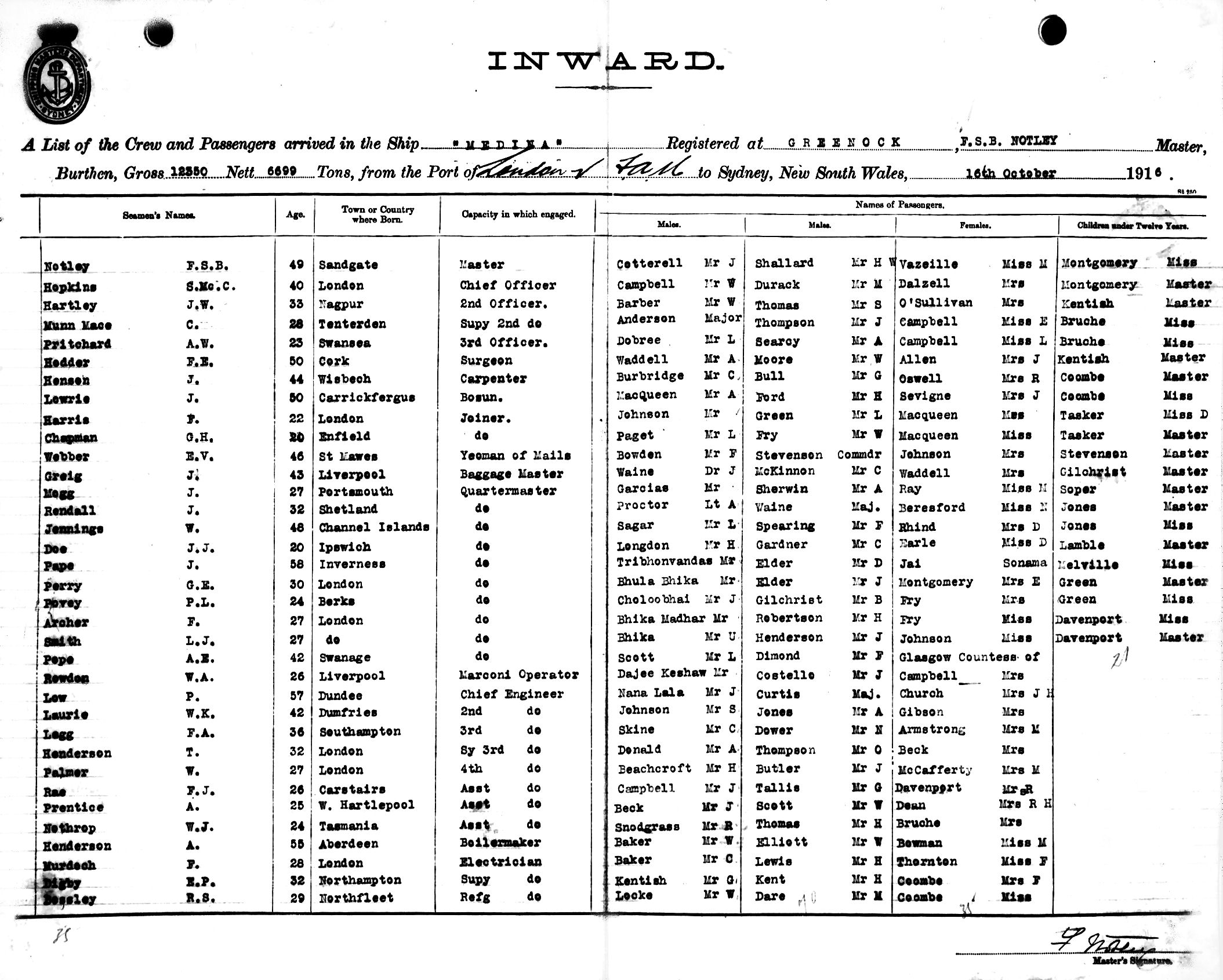 Mariners and ships in Australian Waters | MEDINAOF GREENOCK, F. S. B. NOTLEY, MASTER, BURTHEN 12350/6699 TONS FROM THE PORT OF LONDON via FREMANTLE, ADELAIDE & MELBOURNE TO SYDNEY, NEW SOUTH WALES, 16TH OCTOBER 1916 |