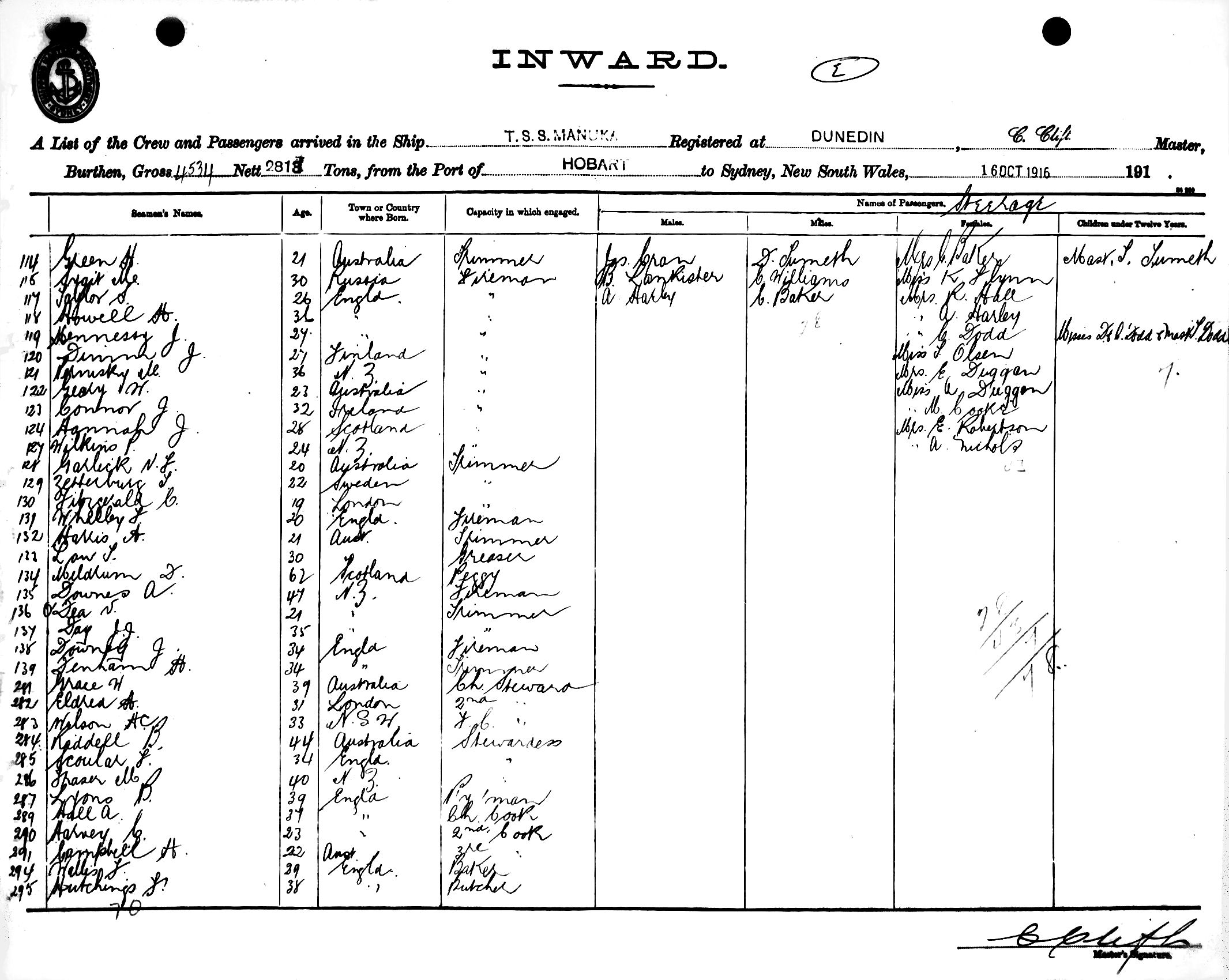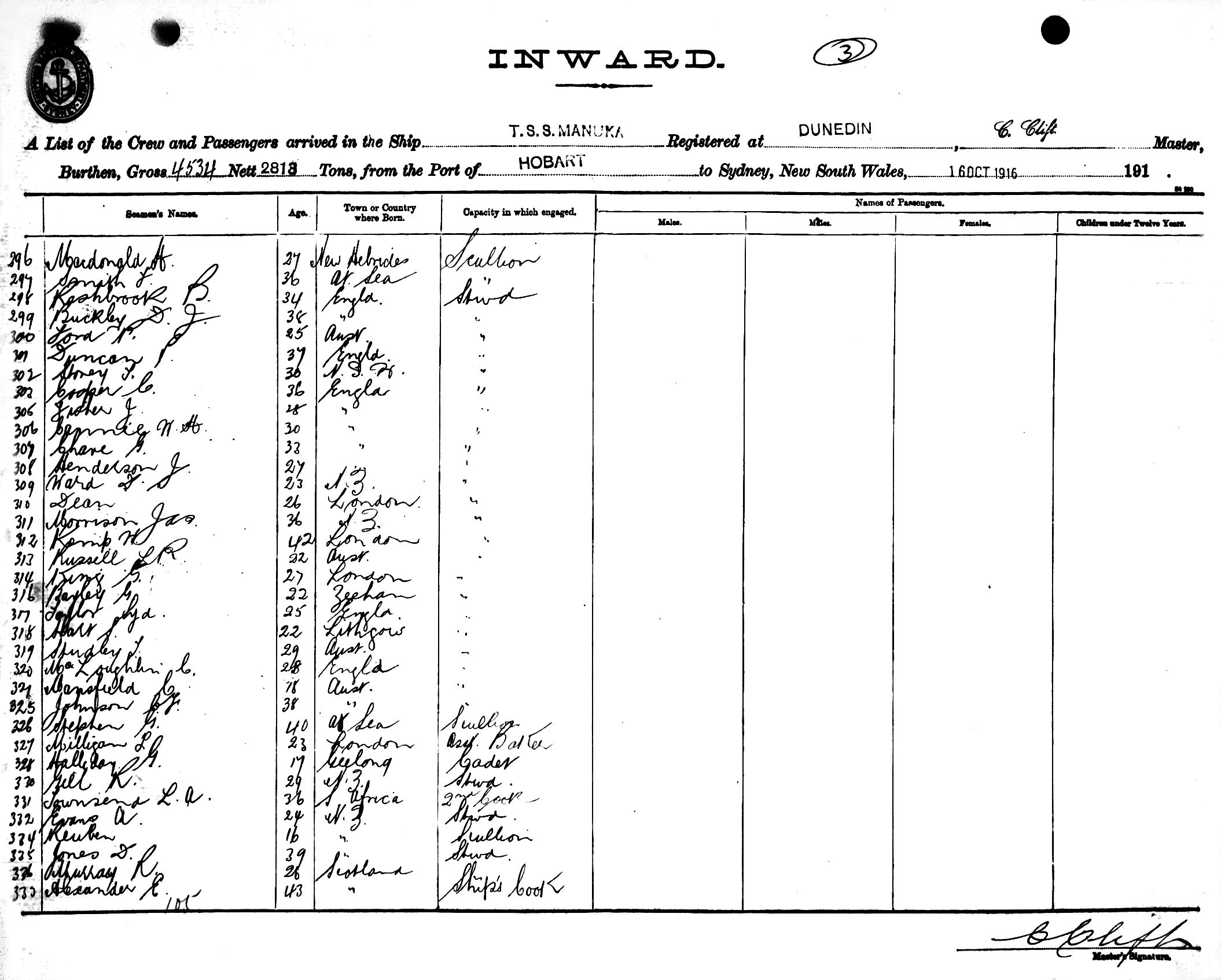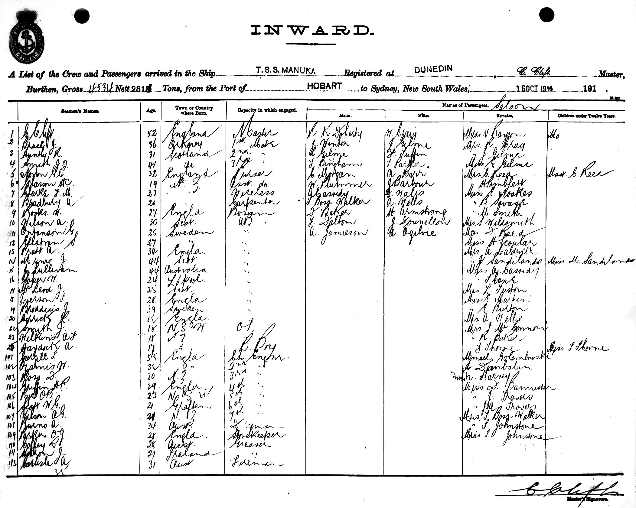 MANUKAOF DUNEDIN, C. CLIFT, MASTER, BURTHEN 4534/2818 TONS FROM THE PORT OF HOBART TO SYDNEY, NEW SOUTH WALES, 16TH OCTOBER 1916 |
