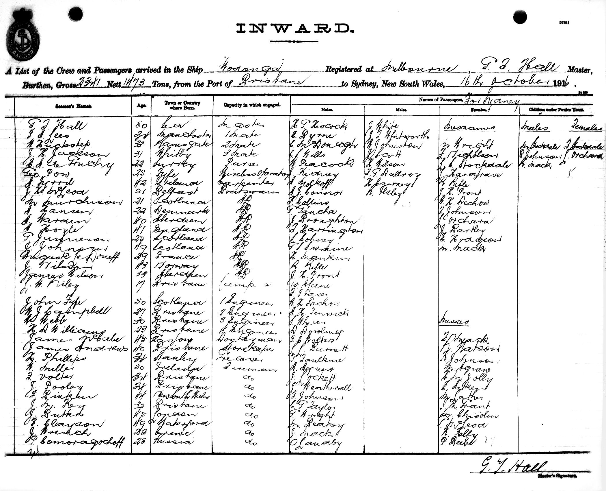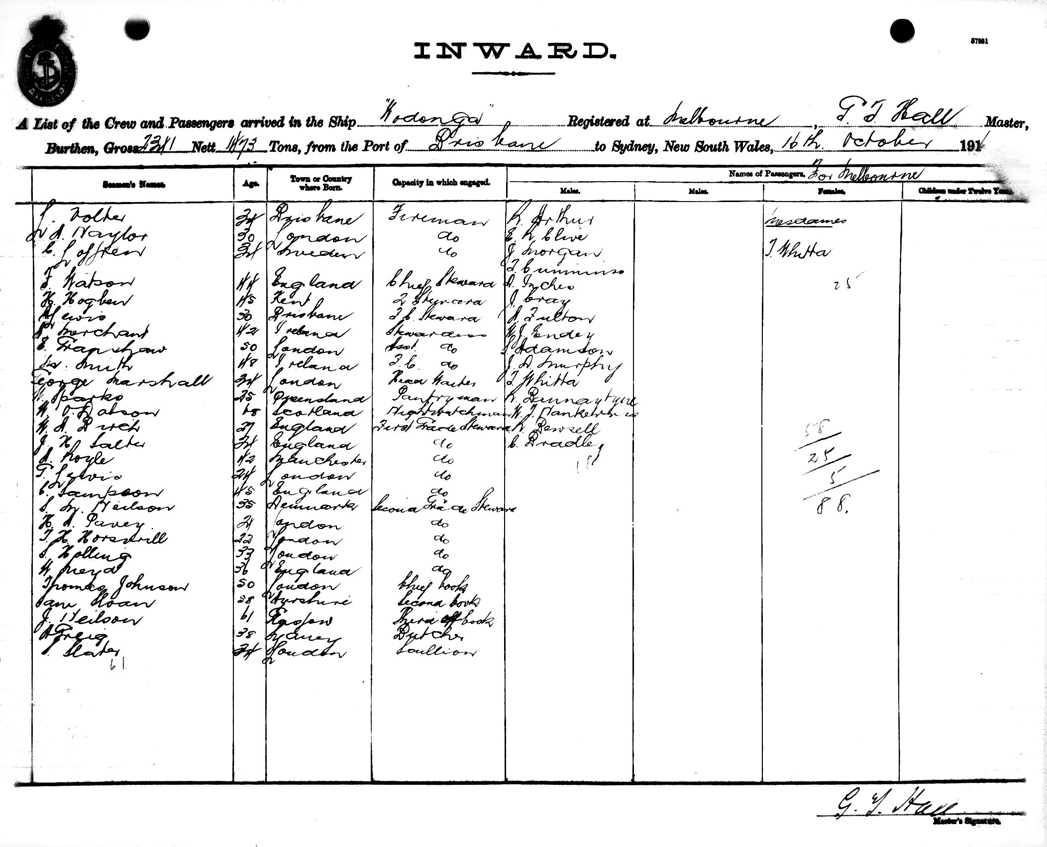 WODONGAOF MELBOURNE, G. F. HALL, MASTER, BURTHEN 2341/1473 TONS FROM THE PORT OF BRISBANE TO SYDNEY, NEW SOUTH WALES, 16TH OCTOBER 1916 |
