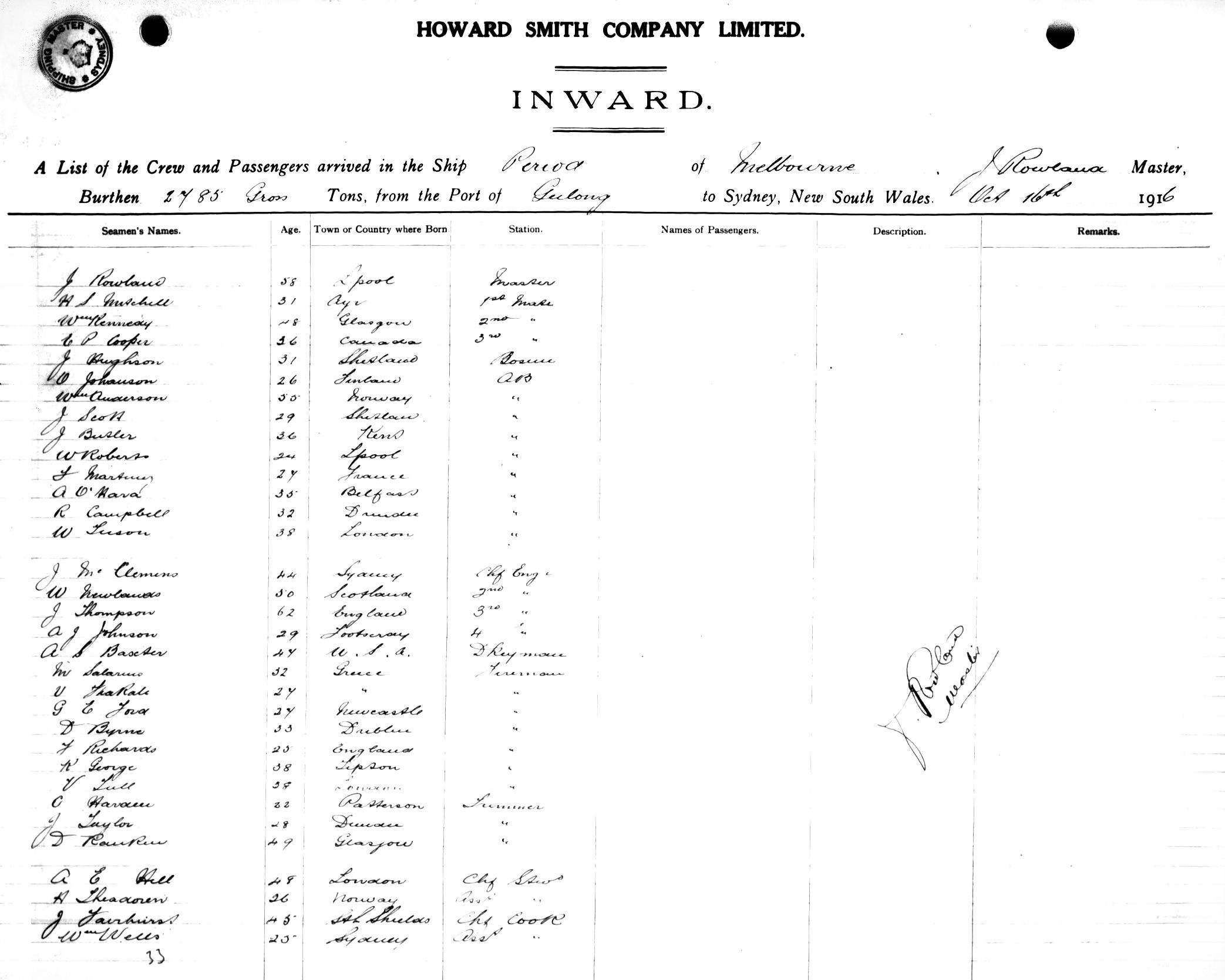 PERIODOF MELBOURNE, J. ROWLAND, MASTER, BURTHEN 2785 TONS FROM THE PORT OF GEELONG TO SYDNEY, NEW SOUTH WALES, 16TH OCTOBER 1916 |