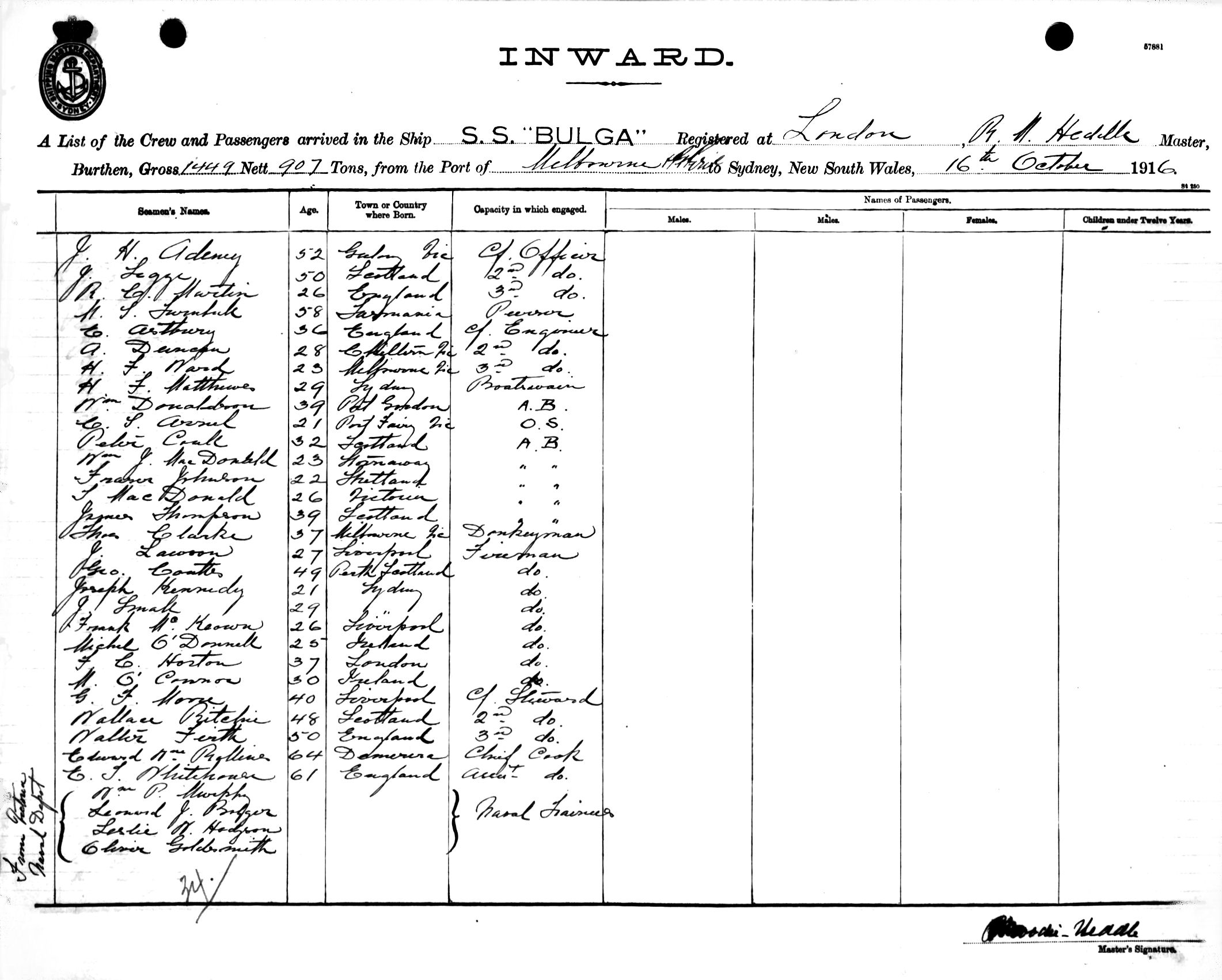 Mariners and ships in Australian Waters | BULGAOF LONDON, R. MOODIE HEDDLE, MASTER, BURTHEN 1449/907 TONS FROM THE PORT OF PORT PIRIE & MELBOURNE TO SYDNEY, NEW SOUTH WALES, 16TH OCTOBER 1916 |