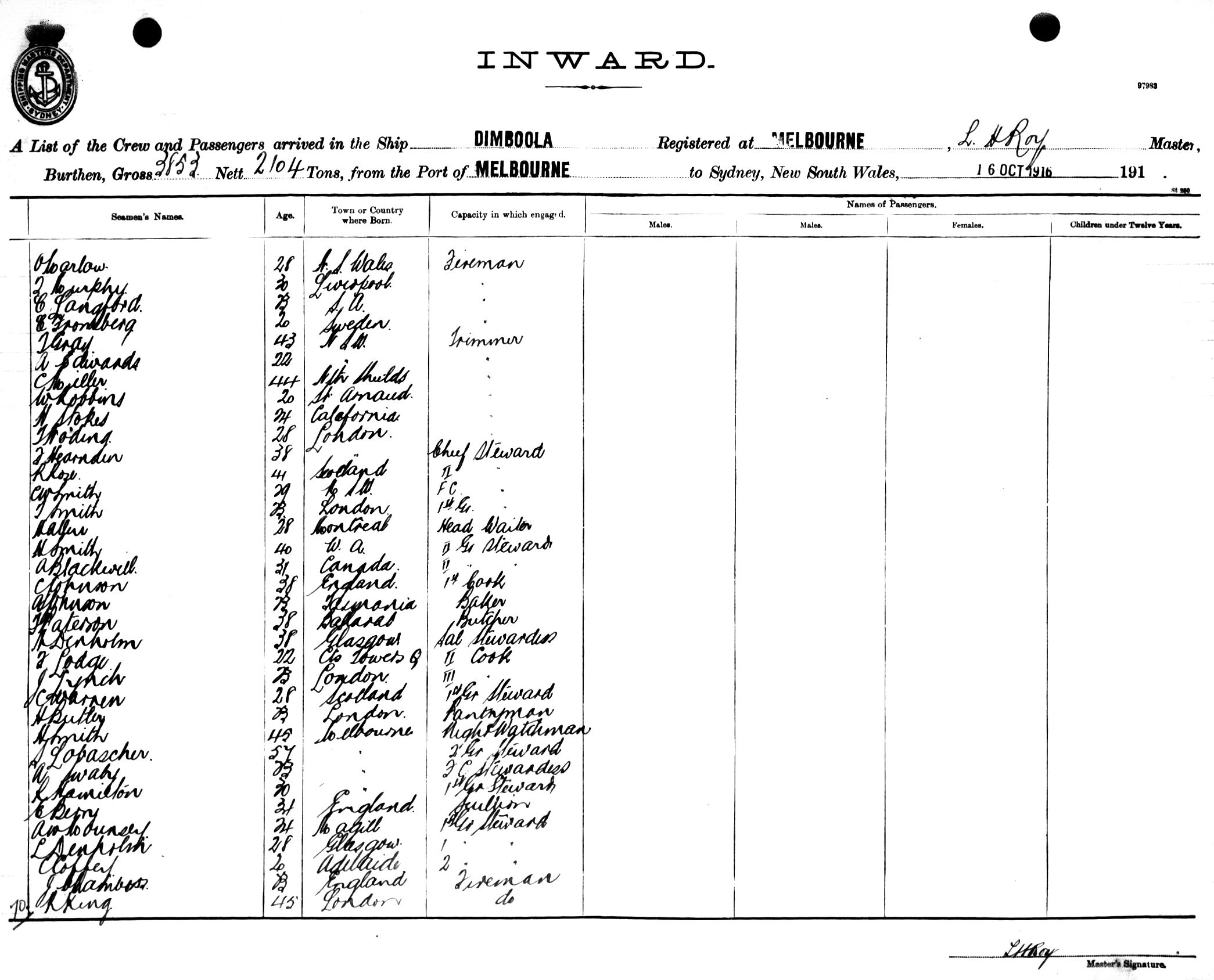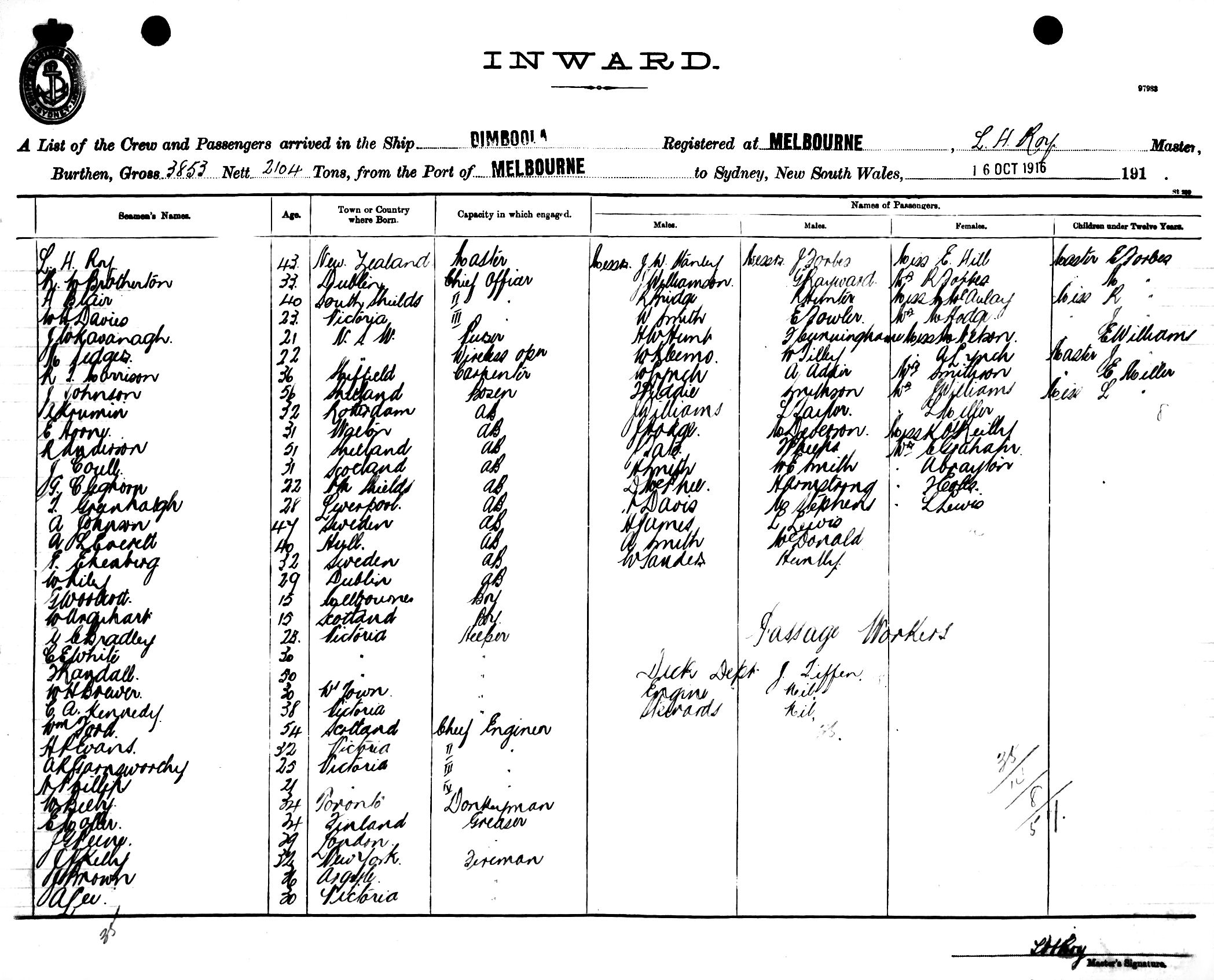 DIMBOOLAOF MELBOURNE, L. H. ROY, MASTER, BURTHEN 3853/2104 TONS FROM THE PORT OF MELBOURNE TO SYDNEY, NEW SOUTH WALES, 16TH OCTOBER 1916 |