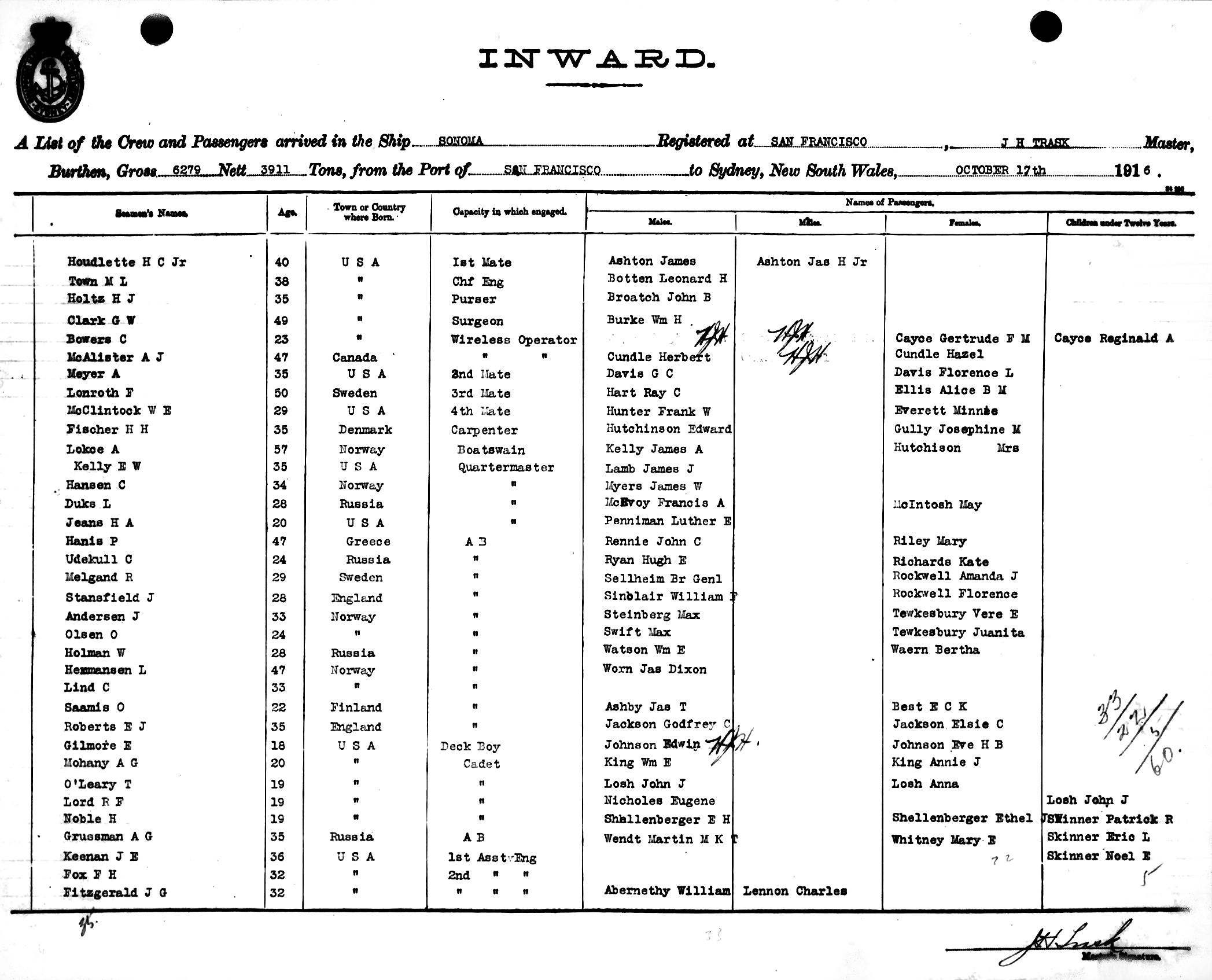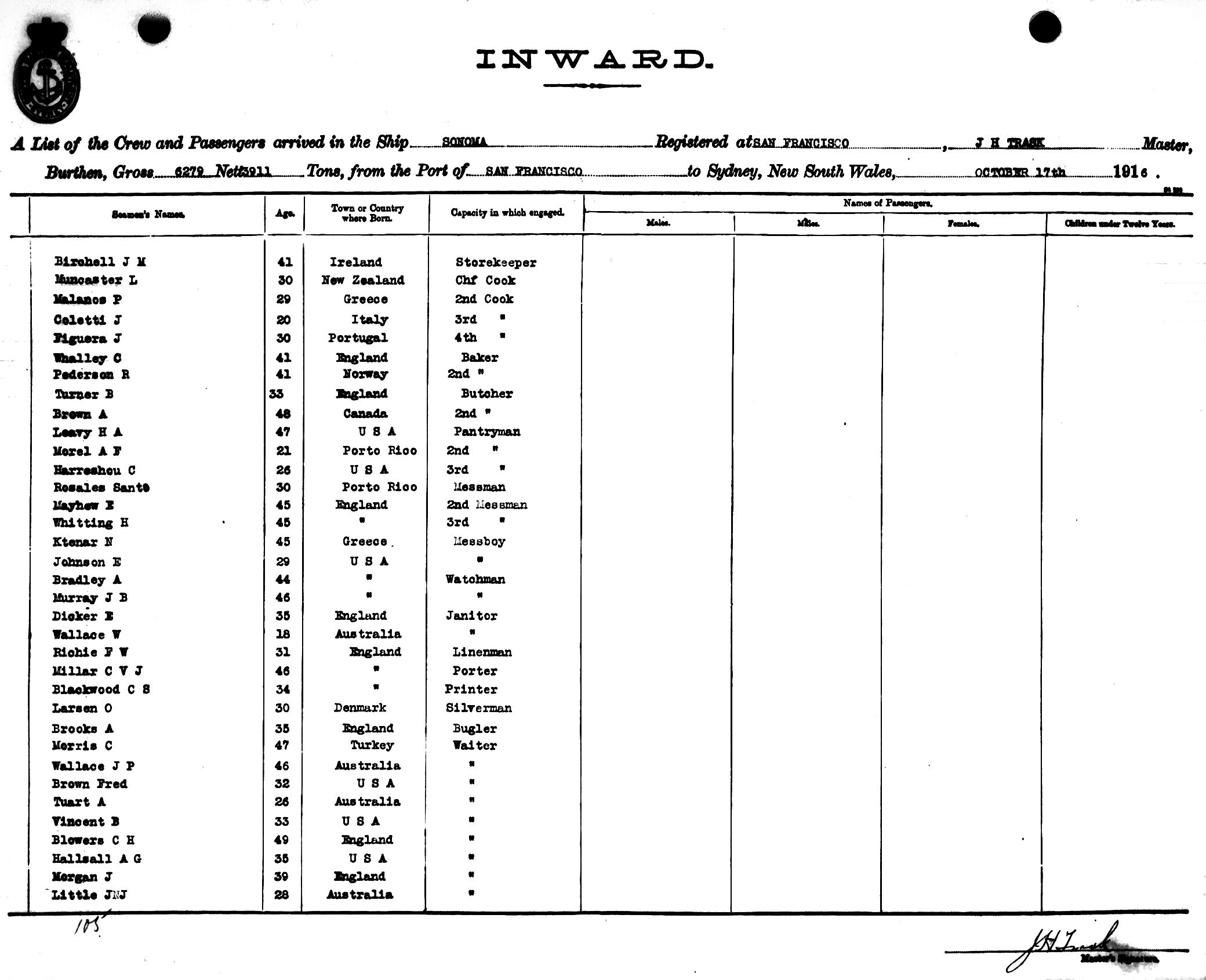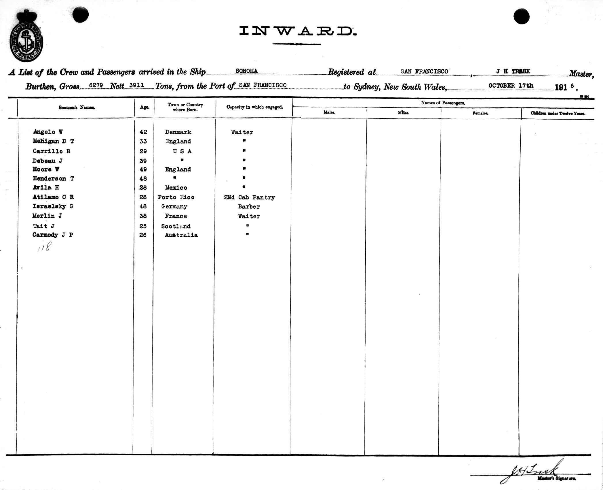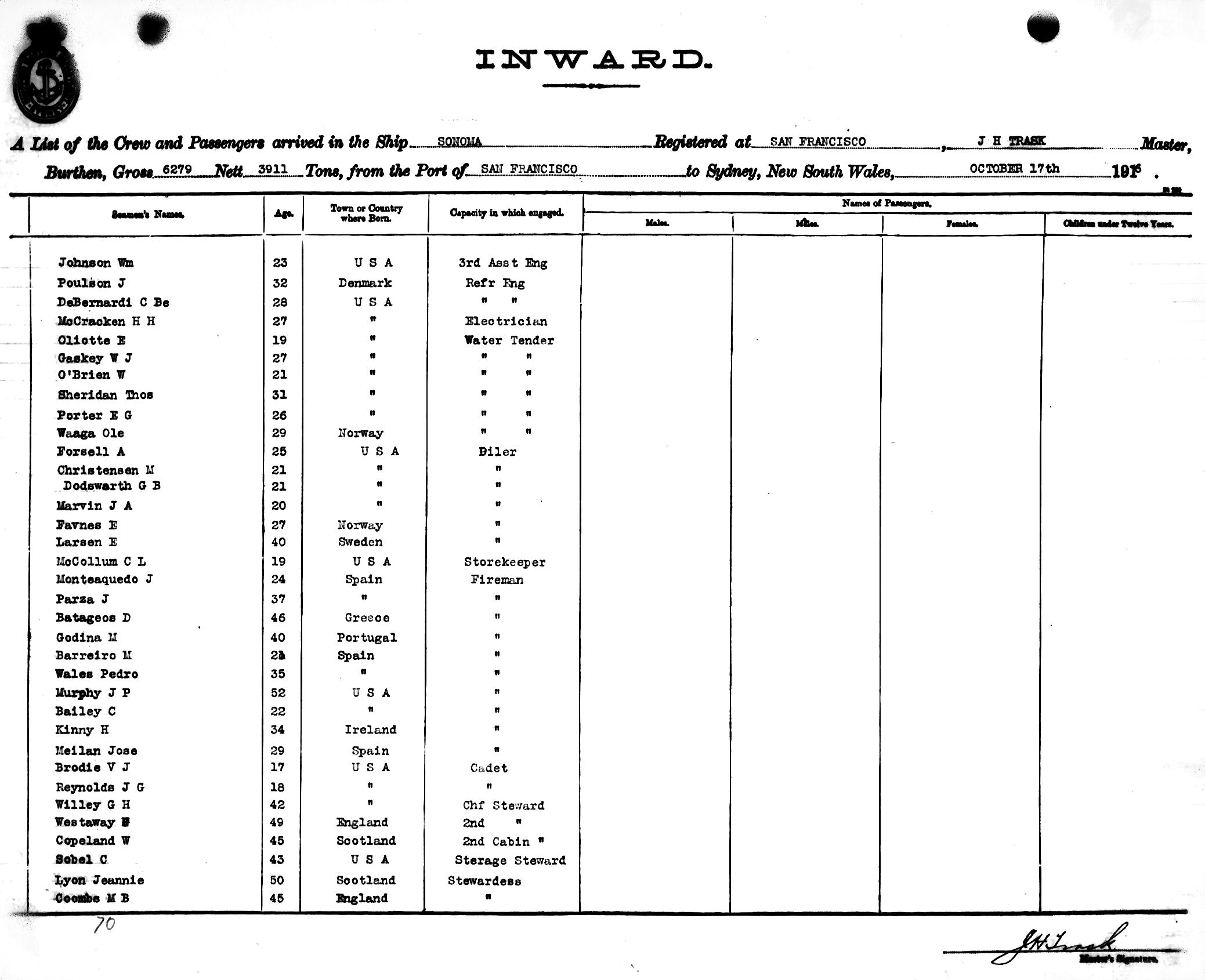 Mariners and ships in Australian Waters | SONOMAOF SAN FRANCISCO, J. H. TRASK, MASTER, BURTHEN 6279/3911 TONS FROM THE PORT OF SAN FRANCISCO TO SYDNEY, NEW SOUTH WALES, 3RD JANUARY 1900