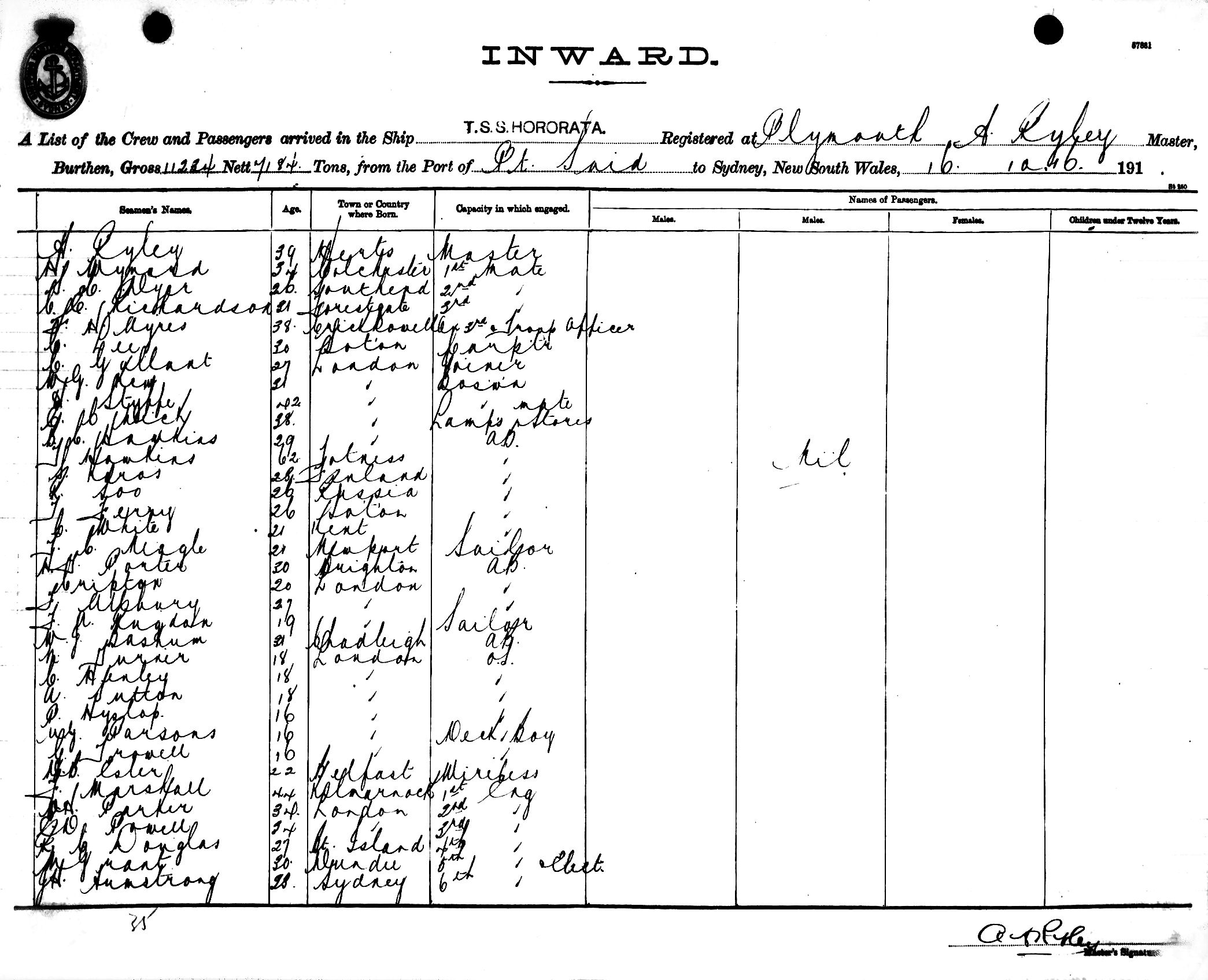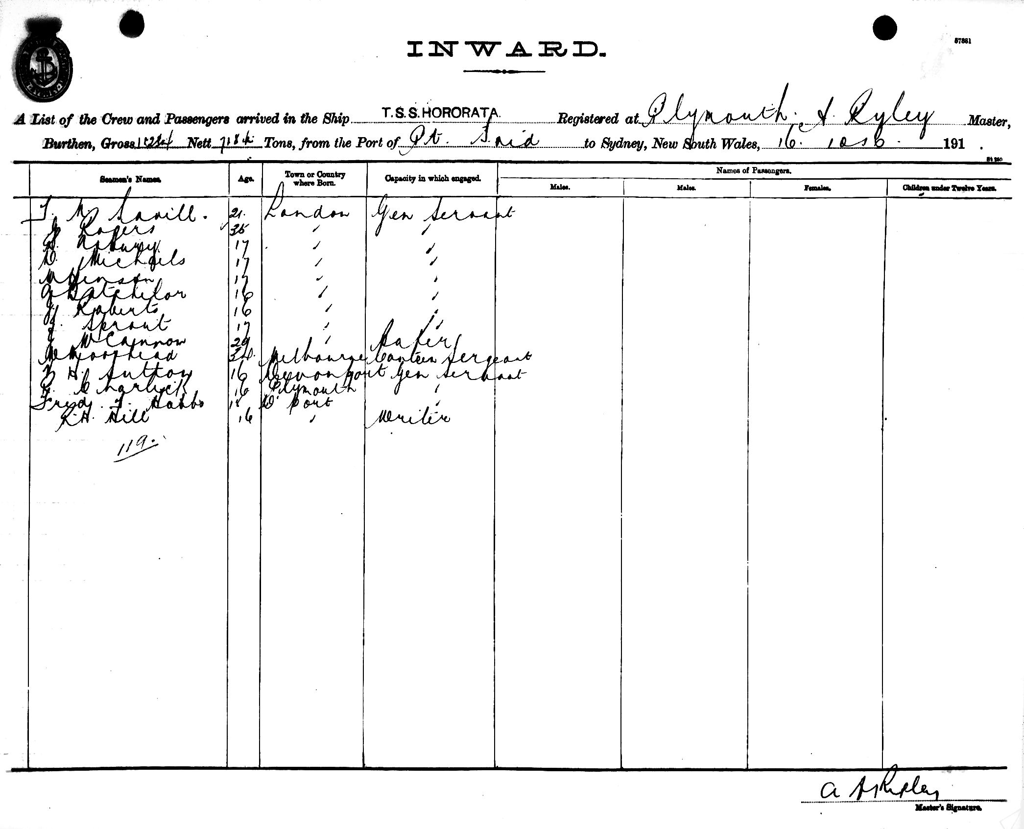 HORORATAOF PLYMOUTH, A. RYLEY, MASTER, BURTHEN 11234/7184 TONS FROM THE PORT OF PORT SAID TO SYDNEY, NEW SOUTH WALES, 16TH OCTOBER 1916 |