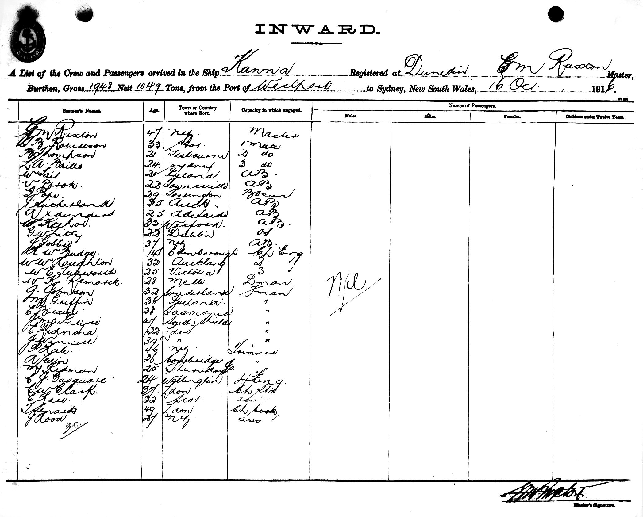 KANNAOF DUNEDIN, G. M. RUXTON, MASTER, BURTHEN 1948/1049 TONS FROM THE PORT OF WESTPORT TO SYDNEY, NEW SOUTH WALES, 16TH OCTOBER 1916 |