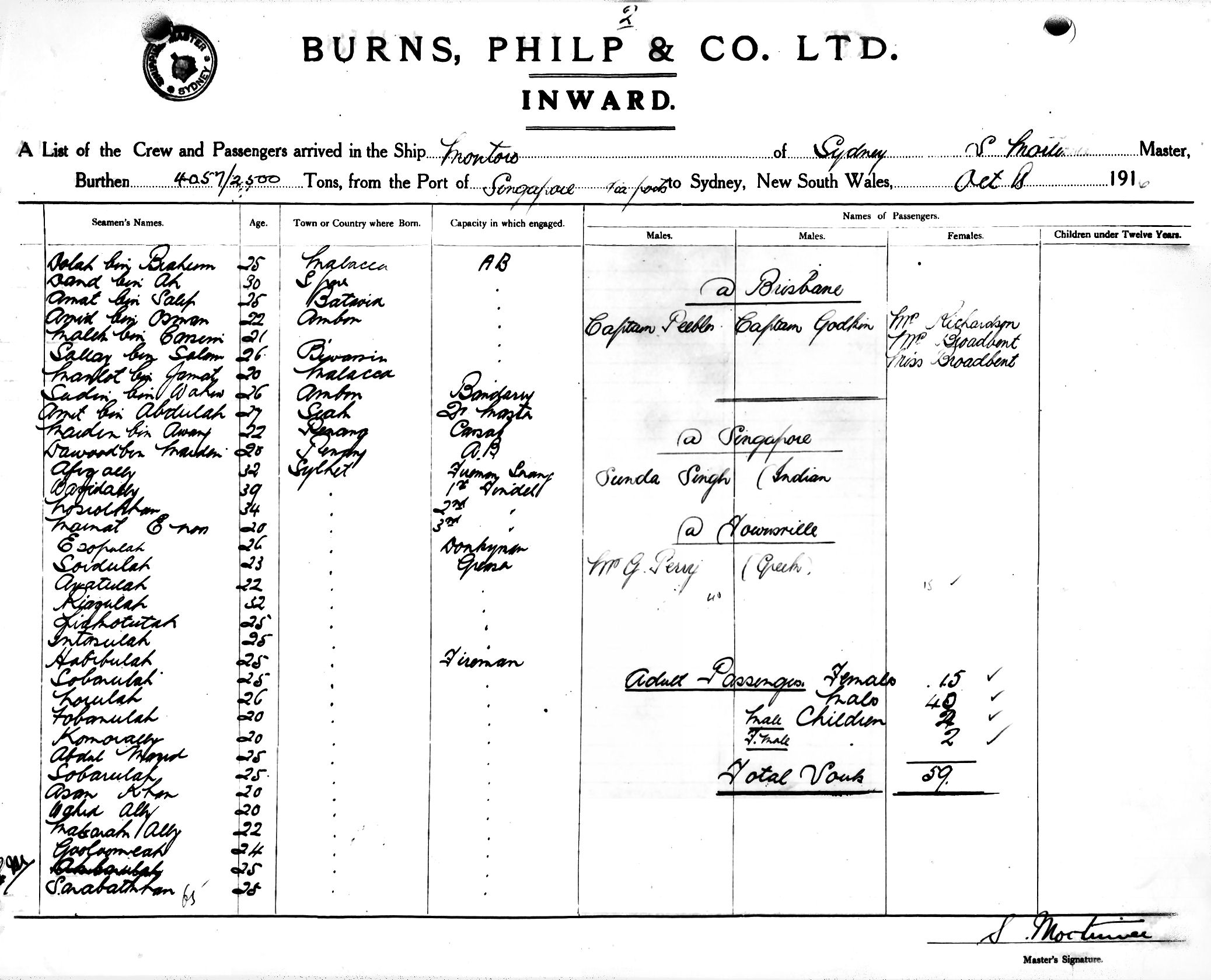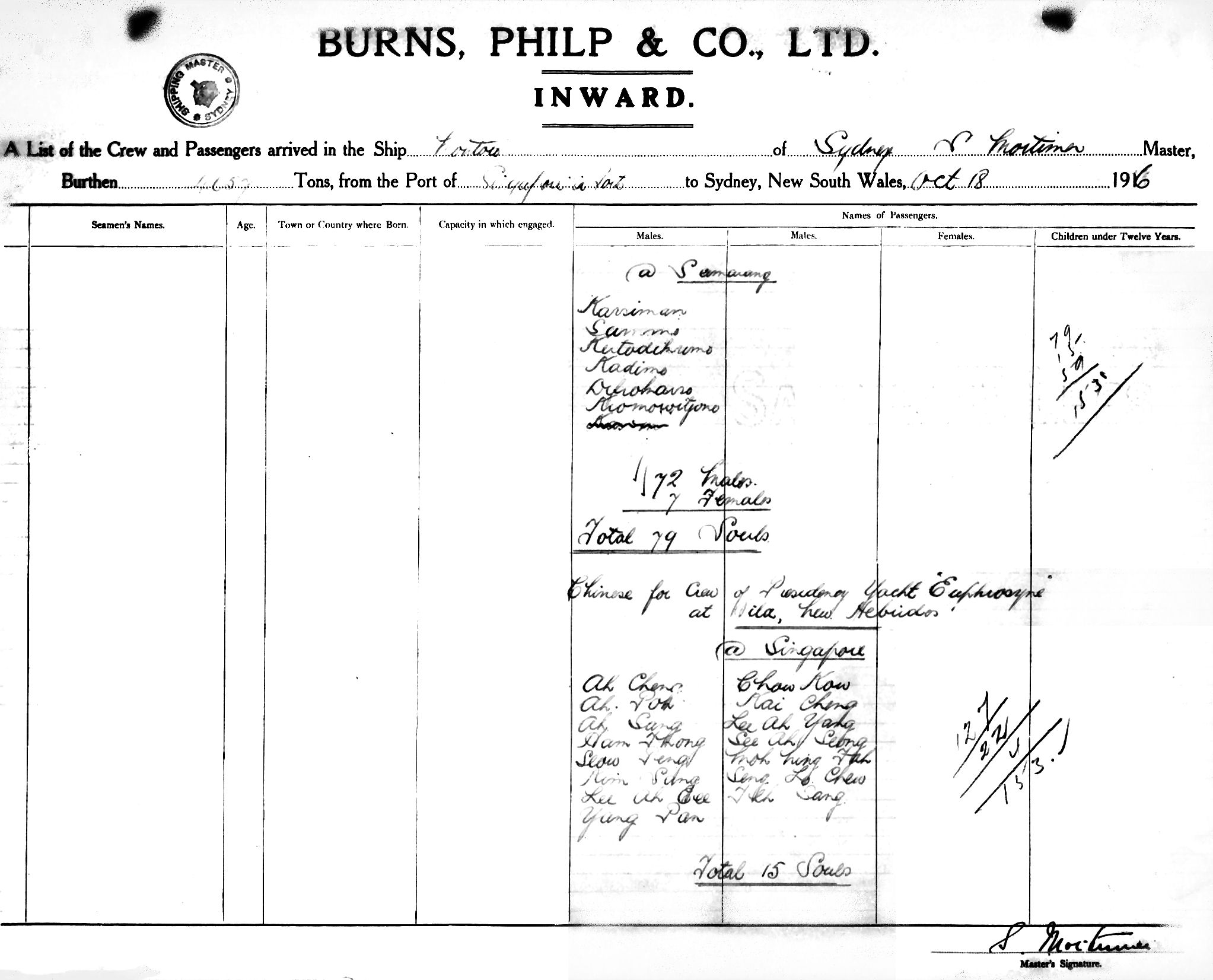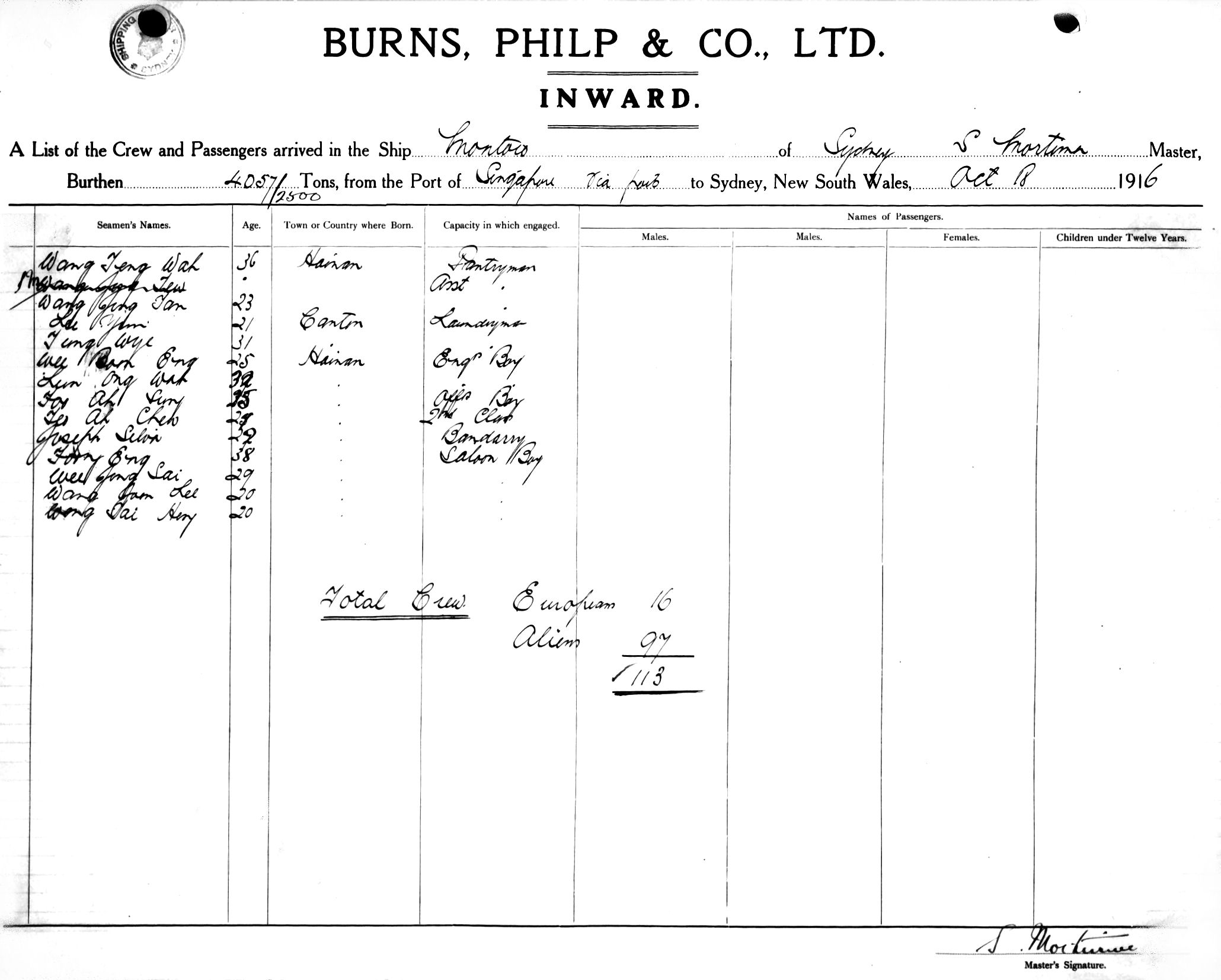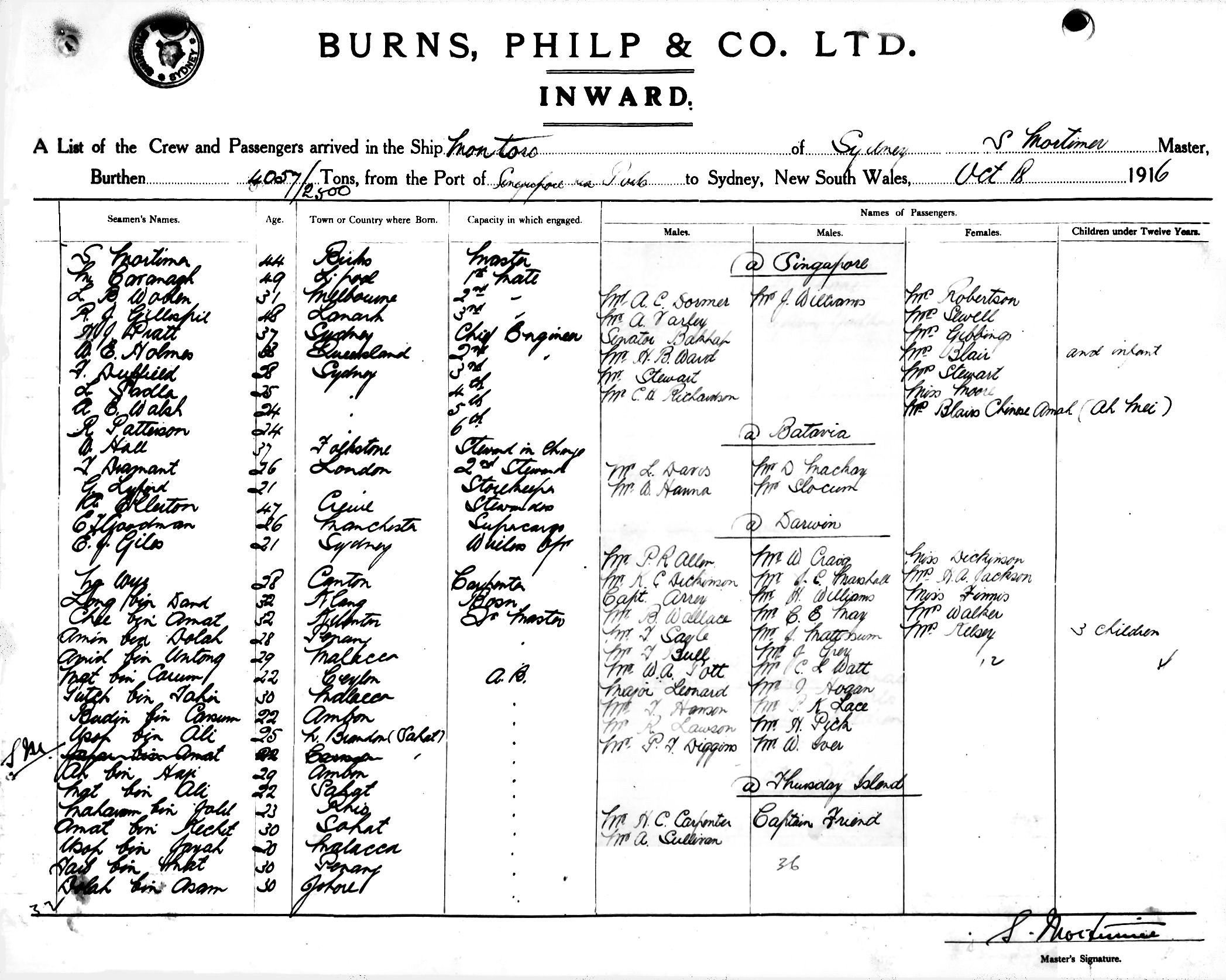 MONTOROOF SYDNEY, S. MORTIMER, MASTER, BURTHEN 4057/2500 TONS FROM THE PORT OF SINGAPORE via PORTS TO SYDNEY, NEW SOUTH WALES, 18TH OCTOBER 1916 |