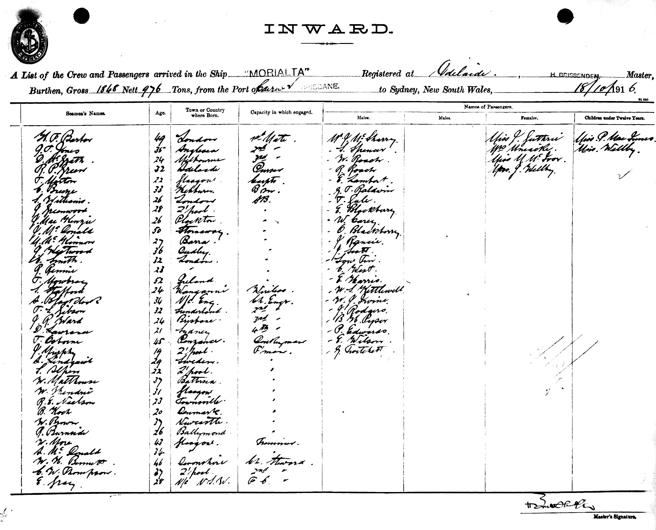 Mariners and ships in Australian Waters | MORIALTAOF ADELAIDE, H. BRISSENDEN, MASTER, BURTHEN 1848/976 TONS FROM THE PORT OF CAIRNS via BRISBANE TO SYDNEY, NEW SOUTH WALES, 18TH OCTOBER 1916 |