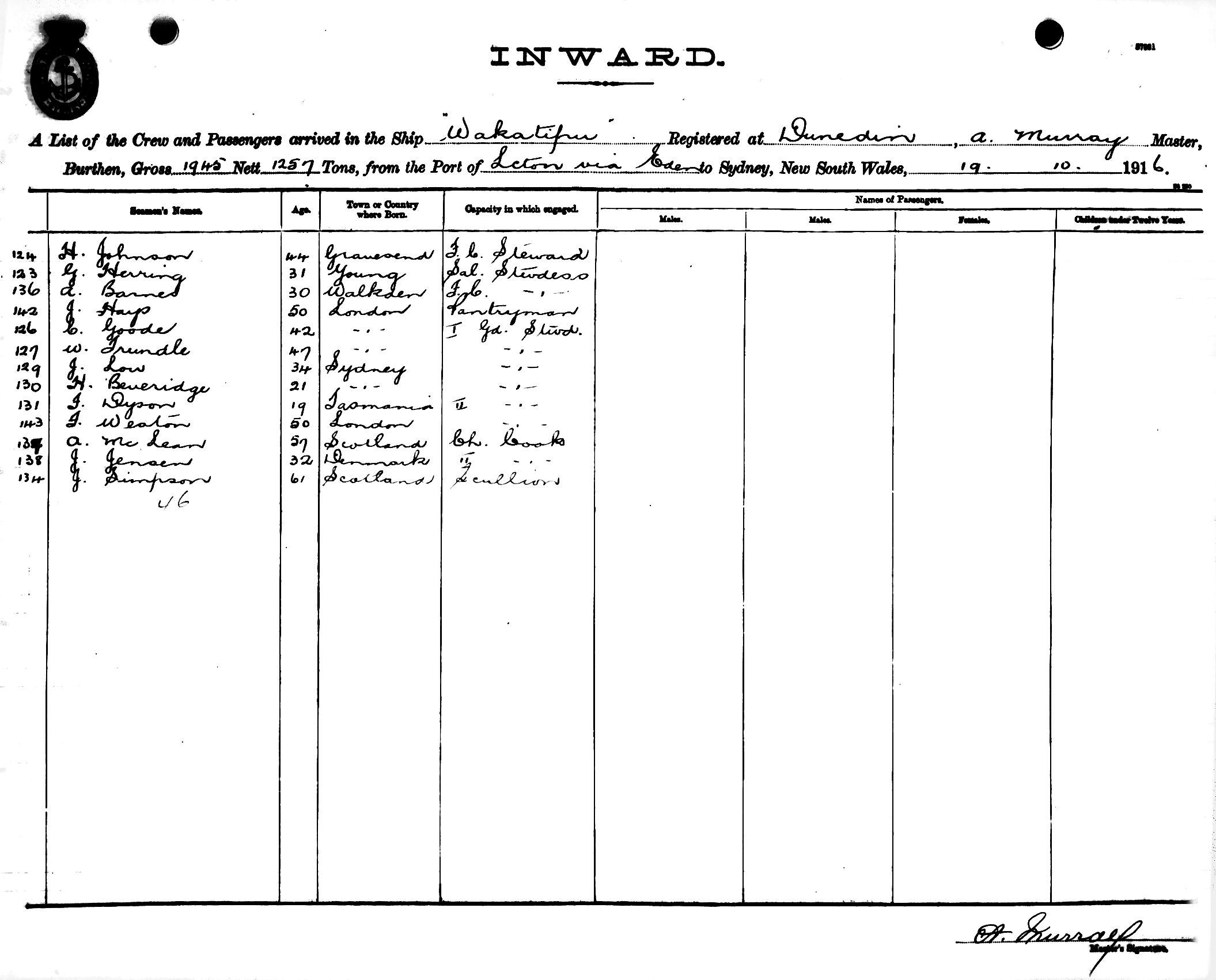 WAKATIPUOF DUNEDIN, A. MURRAY, MASTER, BURTHEN 1945/1257 TONS FROM THE PORT OF LAUNCESTON via EDEN TO SYDNEY, NEW SOUTH WALES, 19TH OCTOBER 1916 |