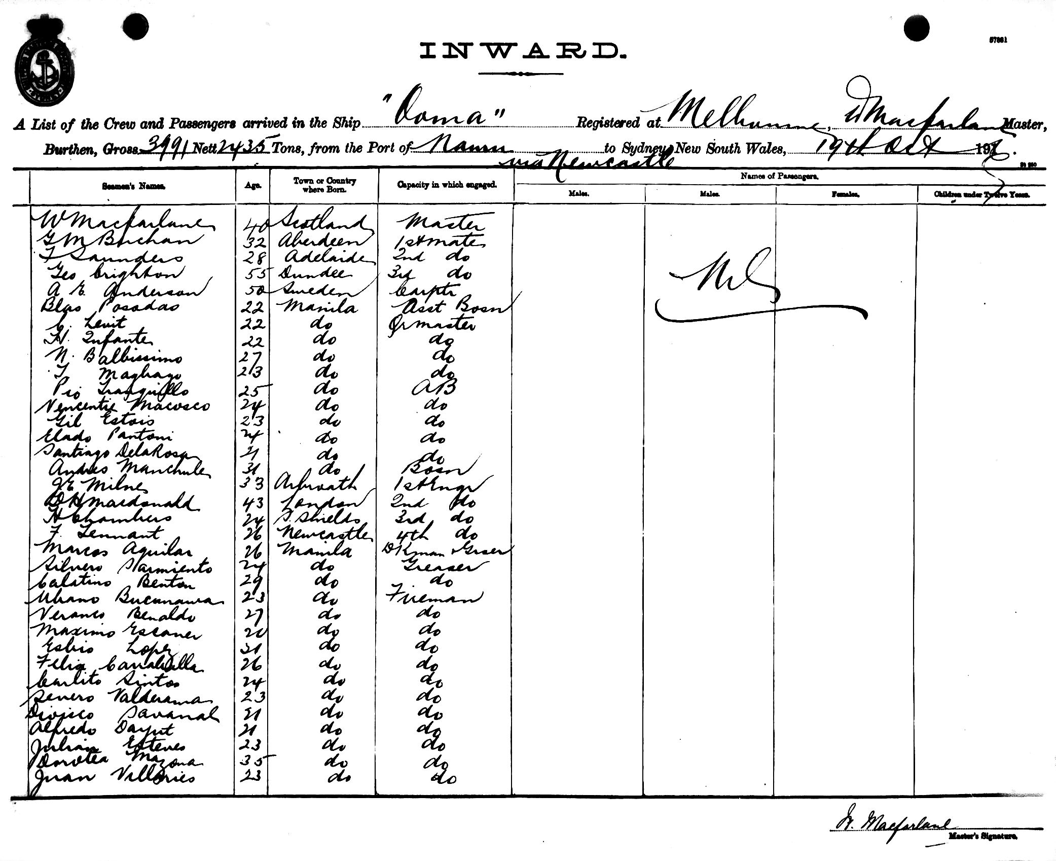 OOMAOF MELBOURNE, W. MACFARLANE, MASTER, BURTHEN 3991/2435 TONS FROM THE PORT OF NAURU via NEWCASTLE TO SYDNEY, NEW SOUTH WALES, 19TH OCTOBER 1916 |