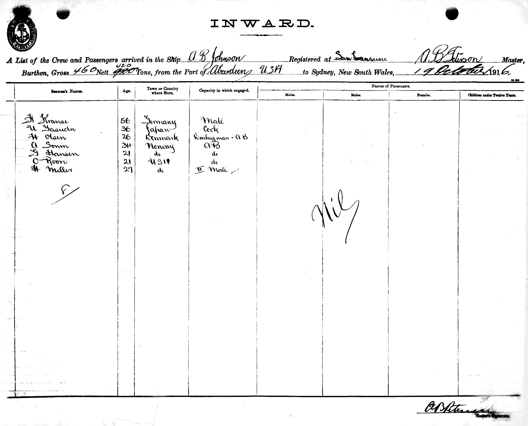A B JOHNSONOF SAN FRANCISCO, A. B. PETERSEN, MASTER, BURTHEN 470/420 TONS FROM THE PORT OF ABERDEEN, U.S.A. TO SYDNEY, NEW SOUTH WALES, 19TH OCTOBER 1916 |