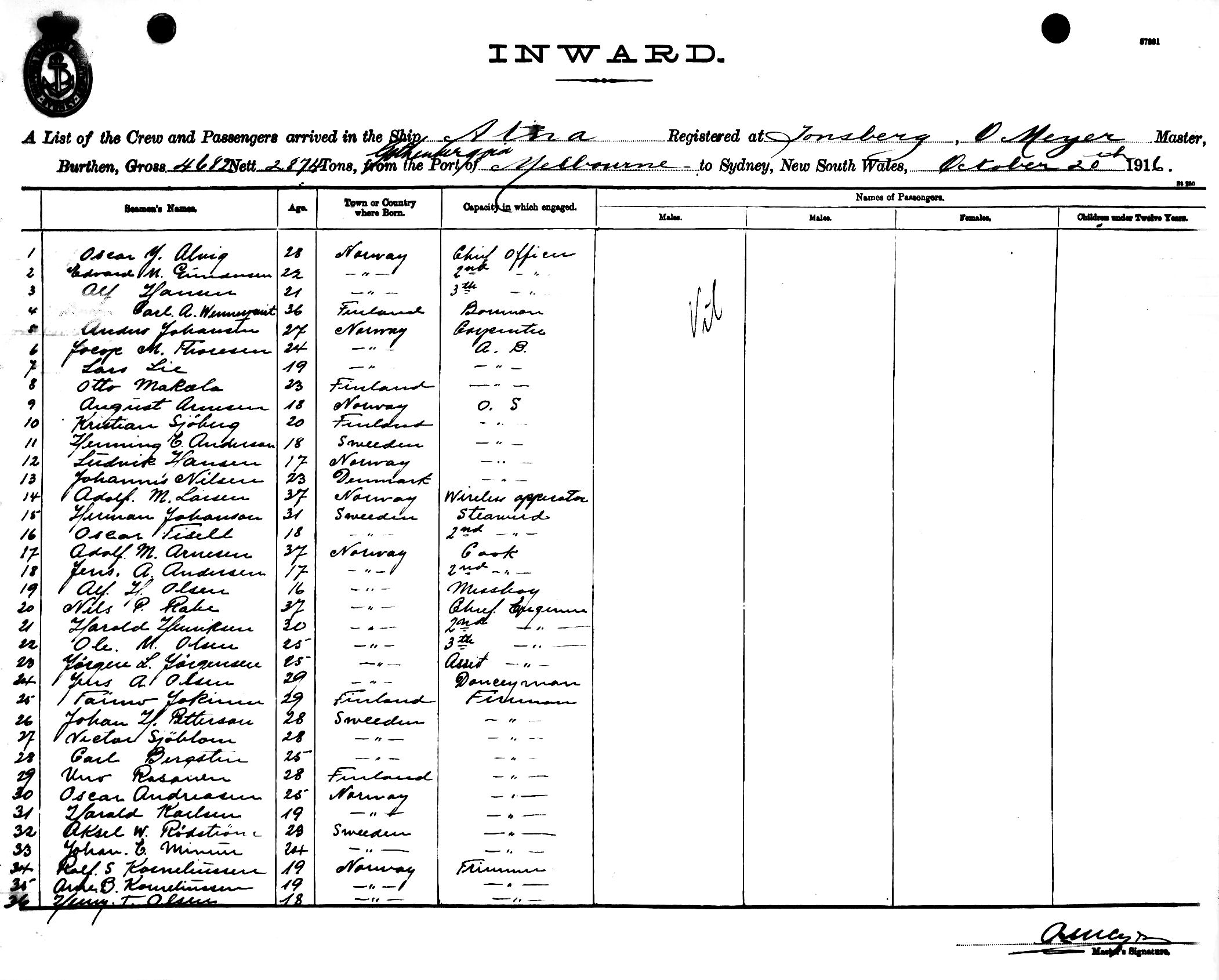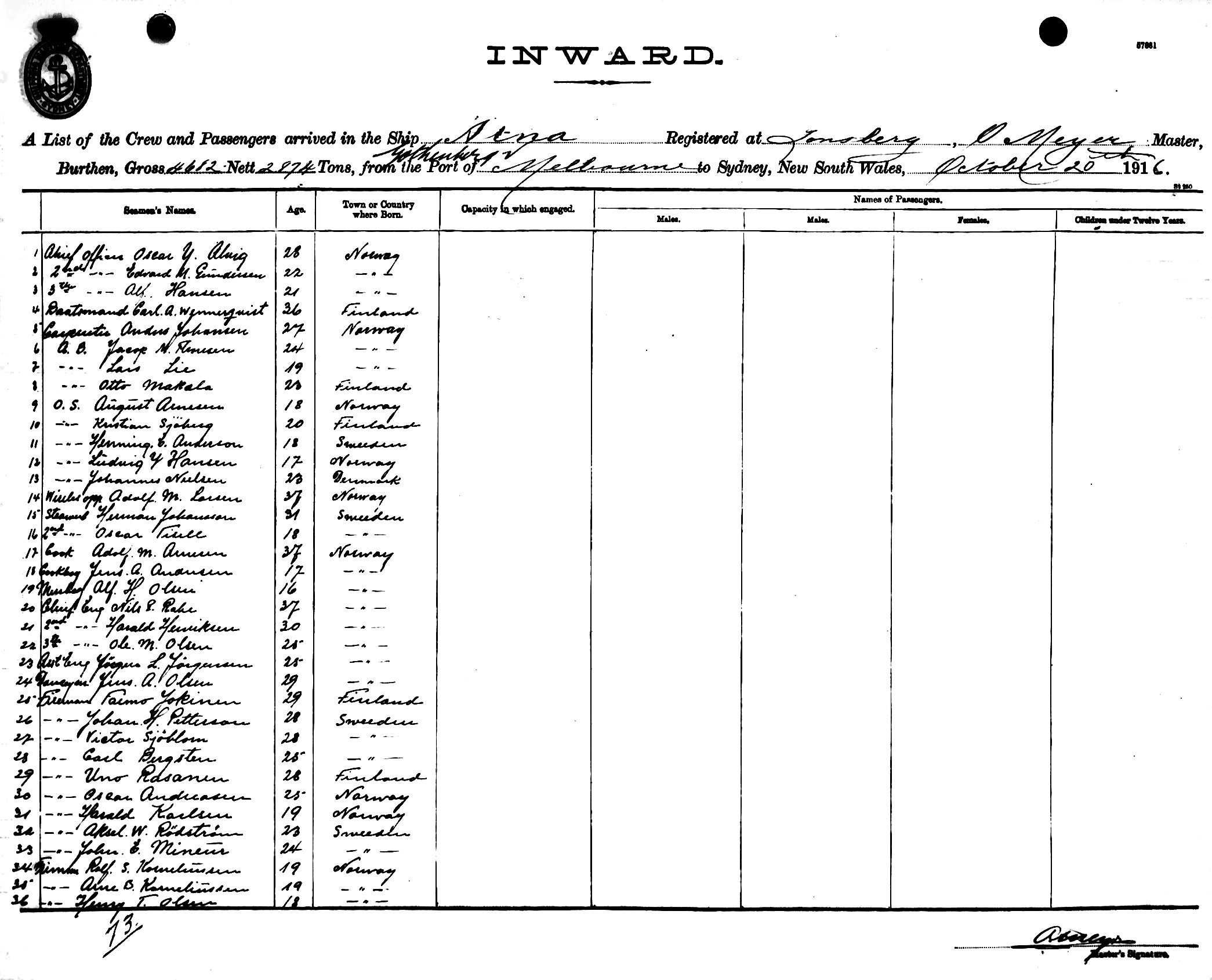 ATNAOF TONSBERG, NORWAY, O. MEYER, MASTER, BURTHEN 4682/2874 TONS FROM THE PORT OF GOTHENBURG via MELBOURNE TO SYDNEY, NEW SOUTH WALES, 20TH OCTOBER 1916 |