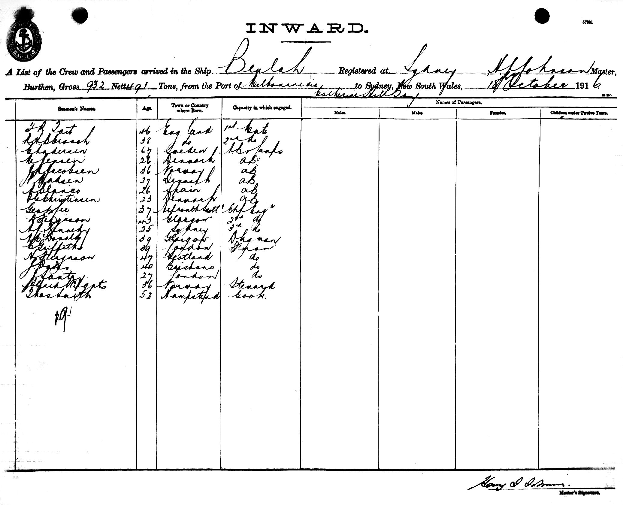 BEULAHOF SYDNEY, H. J. JOHNSON, MASTER, BURTHEN 932/491 TONS FROM THE PORT OF MELBOURNE via CATHERINE HILL BAY TO SYDNEY, NEW SOUTH WALES, 18TH OCTOBER 1916 |