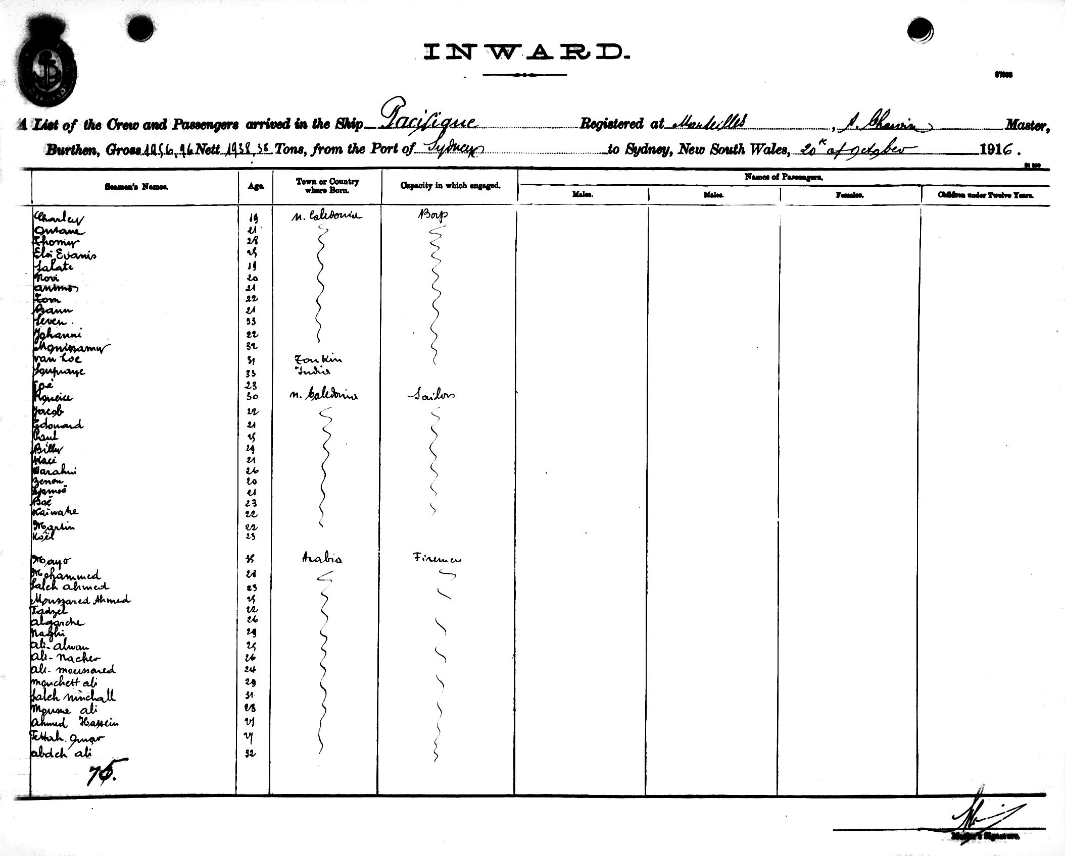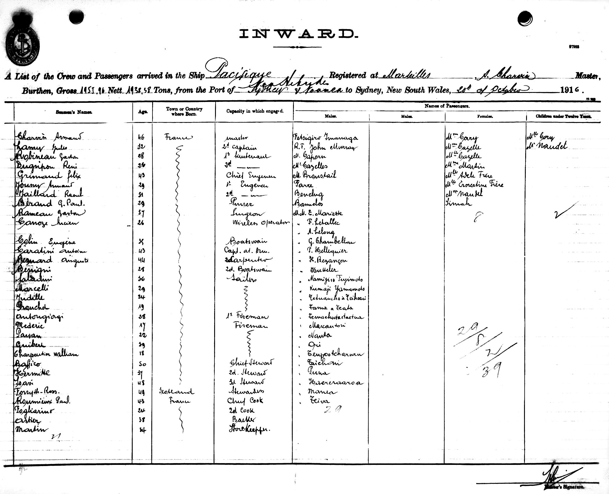 PACIFIQUEOF MARSEILLE, A. CHARVIN, MASTER, BURTHEN 1953.96/1938.38 TONS FROM THE PORT OF NEW HEBRIDES & NOUMEA TO SYDNEY, NEW SOUTH WALES, 20TH OCTOBER 1916 |