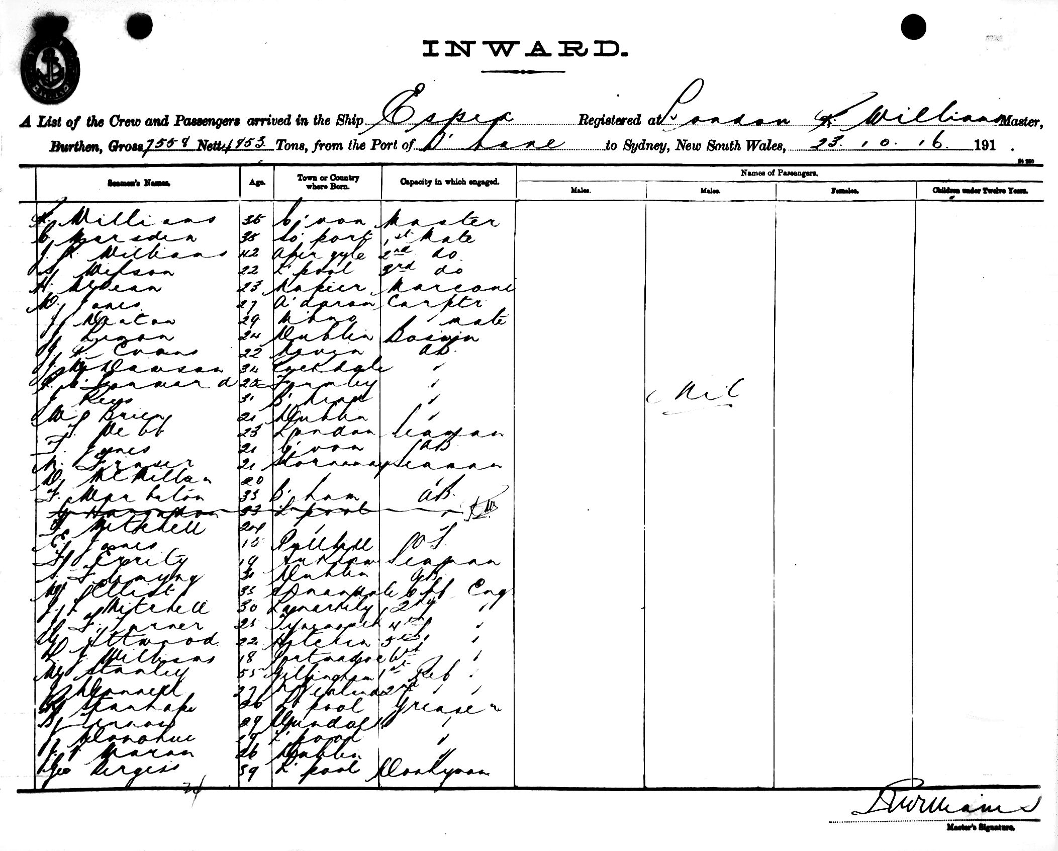 ESSEXOF LONDON, R. WILLIAMS, MASTER, BURTHEN 7558/4853 TONS FROM THE PORT OF BRISBANE TO SYDNEY, NEW SOUTH WALES, 23RD OCTOBER 1916 |