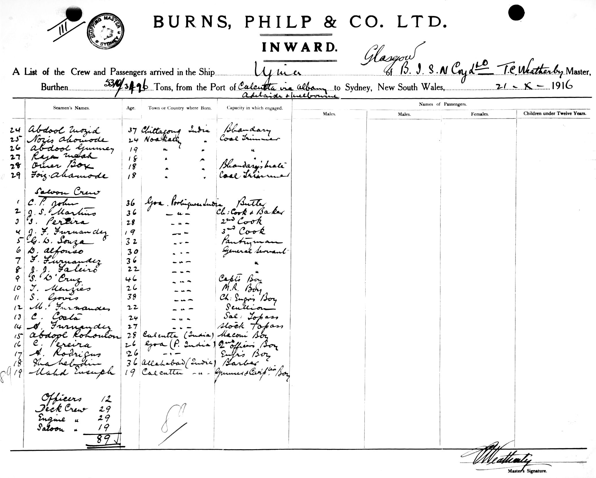 UJINAOF GLASGOW, T. C. WEATHERBY, MASTER, BURTHEN 5310/3426 TONS FROM THE PORT OF CALCUTTA via ALBANY, ADELAIDE & MELBOURNE TO SYDNEY, NEW SOUTH WALES, 21ST OCTOBER 1916 |