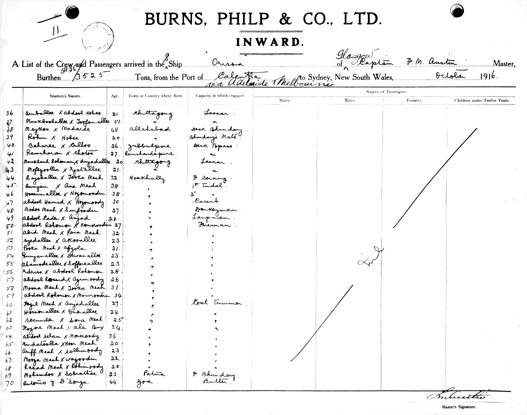 ORISSAOF GLASGOW, F. M. AUSTIN, MASTER, BURTHEN 5436/3525 TONS FROM THE PORT OF CALCUTTA via ADELAIDE & MELBOURNE TO SYDNEY, NEW SOUTH WALES, 22ND OCTOBER 1916 |