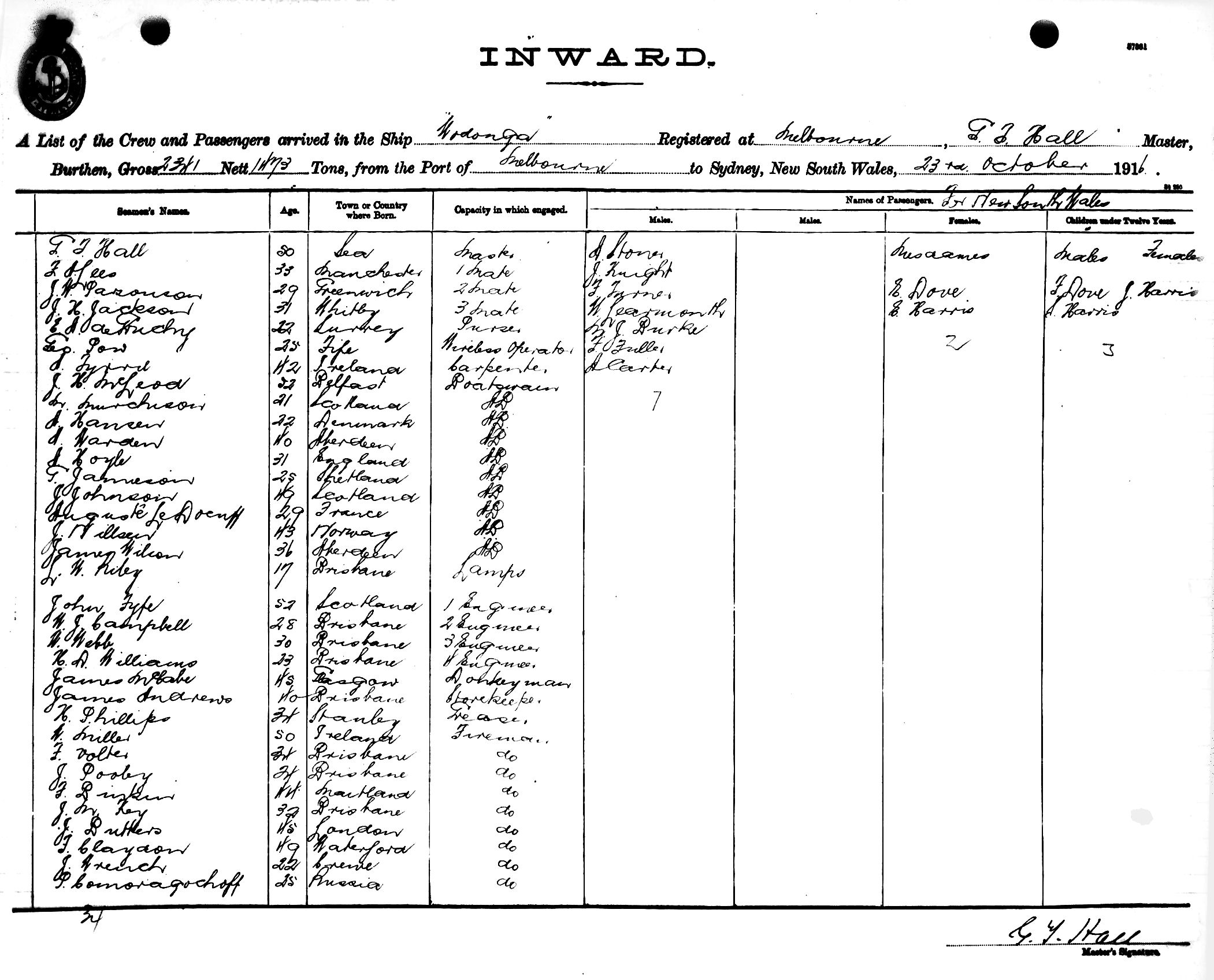 WODONGAOF MELBOURNE, G. T. HALL, MASTER, BURTHEN 2341/1473 TONS FROM THE PORT OF MELBOURNE TO SYDNEY, NEW SOUTH WALES, 23RD OCTOBER 1916 |