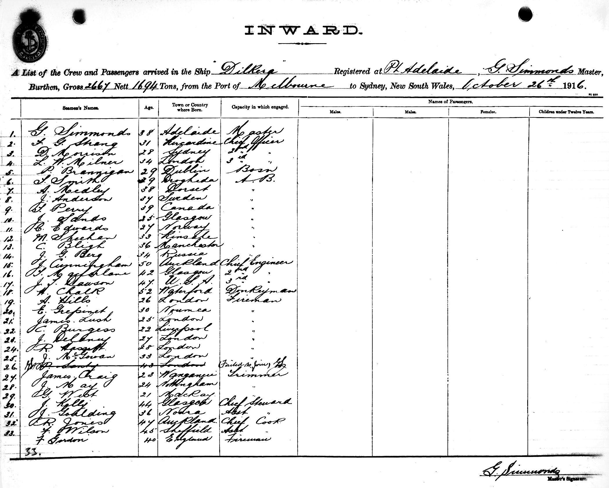 DILKERAOF PORT ADELAIDE, G. SIMMONDS, MASTER, BURTHEN 2667/1694 TONS FROM THE PORT OF MELBOURNE TO SYDNEY, NEW SOUTH WALES, 26TH OCTOBER 1916 |