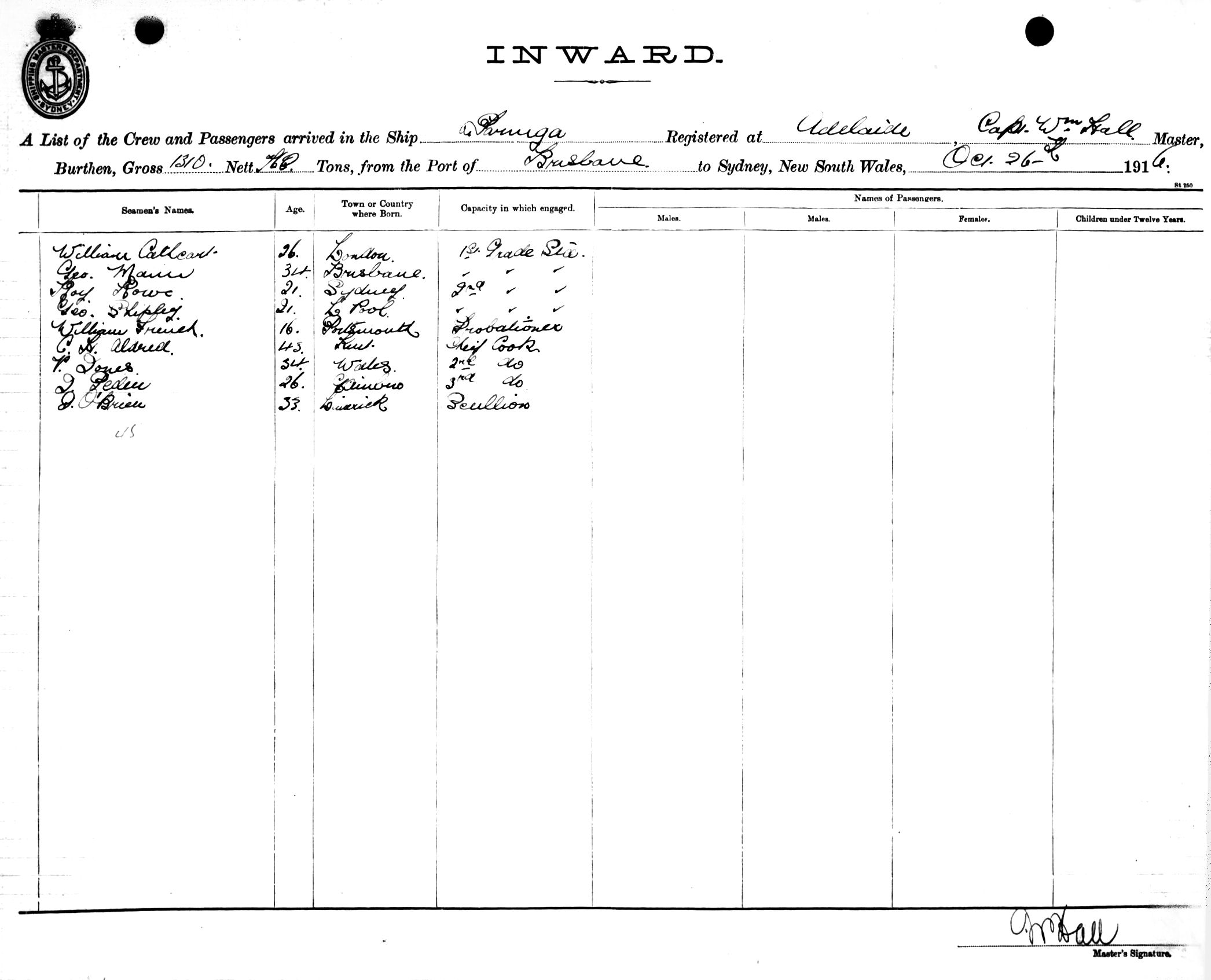 PARINGAOF ADELAIDE, WILLIAM HALL, MASTER, BURTHEN 1310/762 TONS FROM THE PORT OF BRISBANE TO SYDNEY, NEW SOUTH WALES, 26TH OCTOBER 1916 |