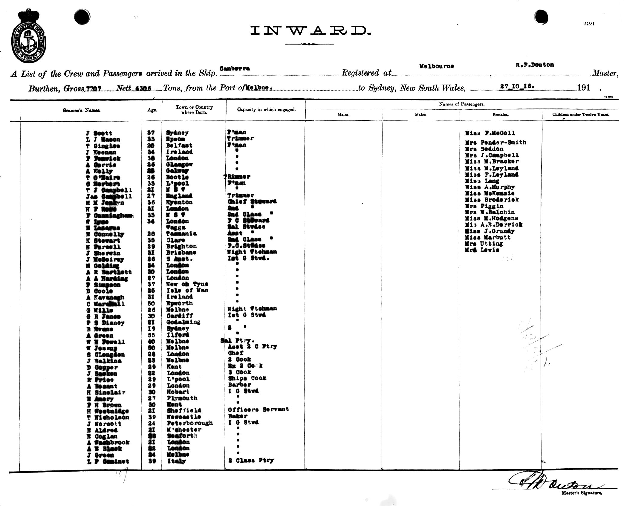 CANBERRAOF MELBOURNE, R. F. DOUTON, MASTER, BURTHEN 7707/4306 TONS FROM THE PORT OF MELBOURNE TO SYDNEY, NEW SOUTH WALES, 27TH OCTOBER 1916 |