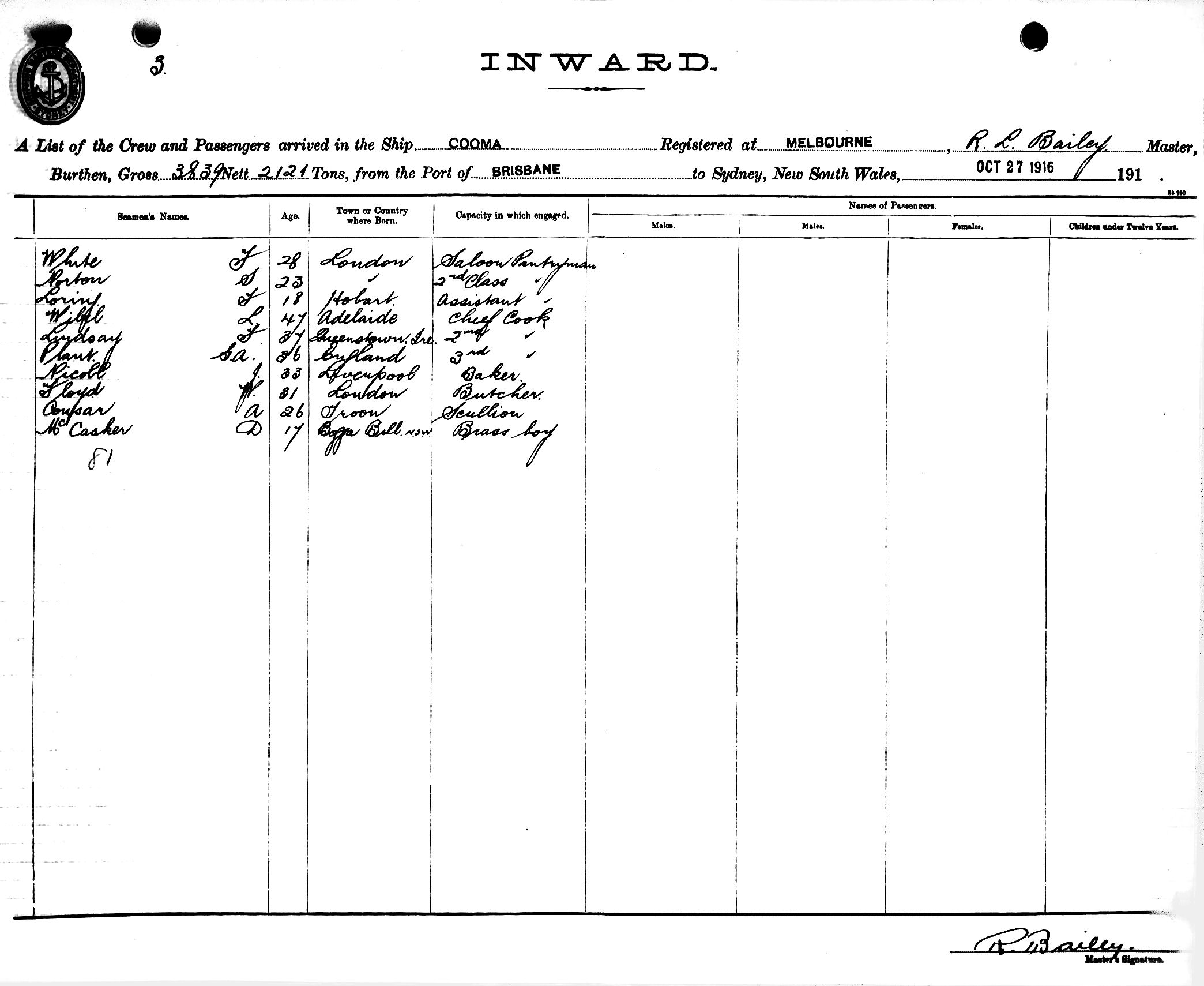 Mariners and ships in Australian Waters | COOMAOF MELBOURNE, R. L. BAILEY, MASTER, BURTHEN 3839/2121 TONS FROM THE PORT OF BRISBANE TO SYDNEY, NEW SOUTH WALES, 27TH OCTOBER 1916 |