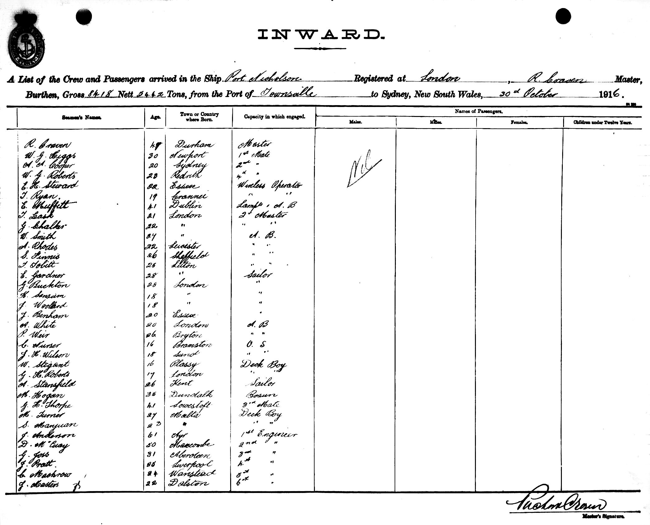 PORT NICHOLSONOF LONDON, R. CRAVEN, MASTER, BURTHEN 8418/5442 TONS FROM THE PORT OF TOWNSVILLE TO SYDNEY, NEW SOUTH WALES, 30TH OCTOBER 1916 |