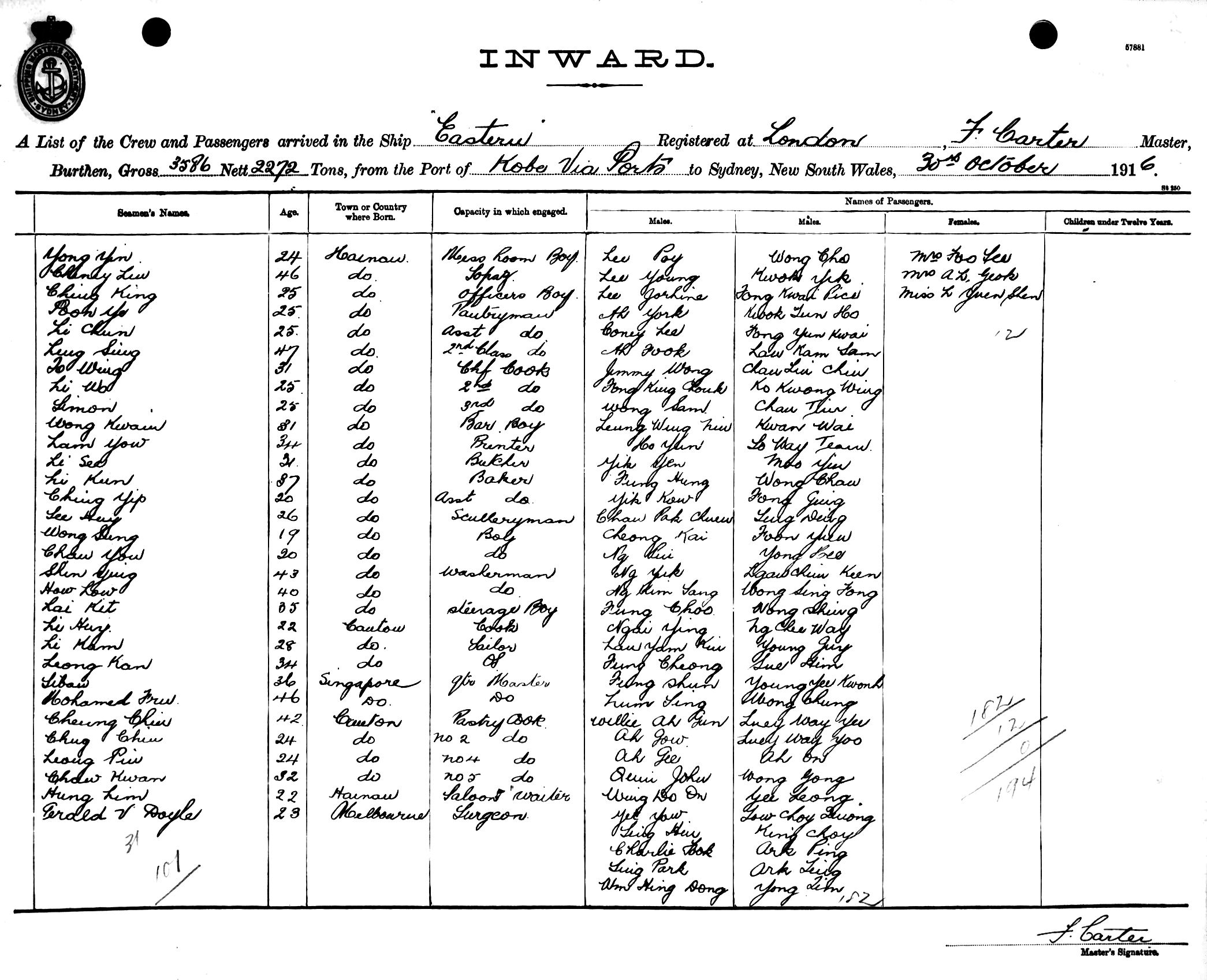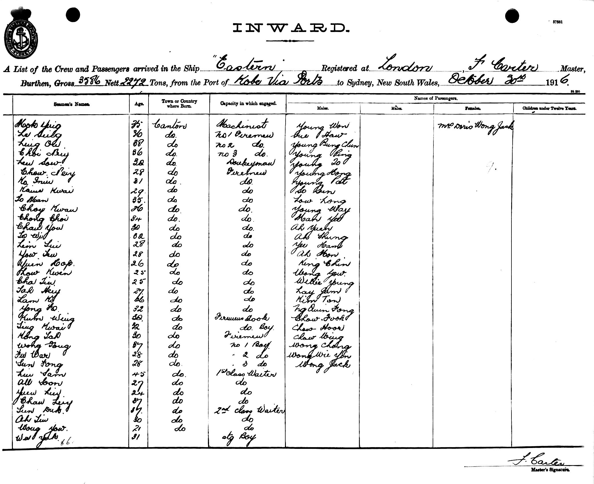 EASTERNOF LONDON, F. CARTER, MASTER, BURTHEN 3586/2272 TONS FROM THE PORT OF KOBE via PORTS TO SYDNEY, NEW SOUTH WALES, 30TH OCTOBER 1916 |