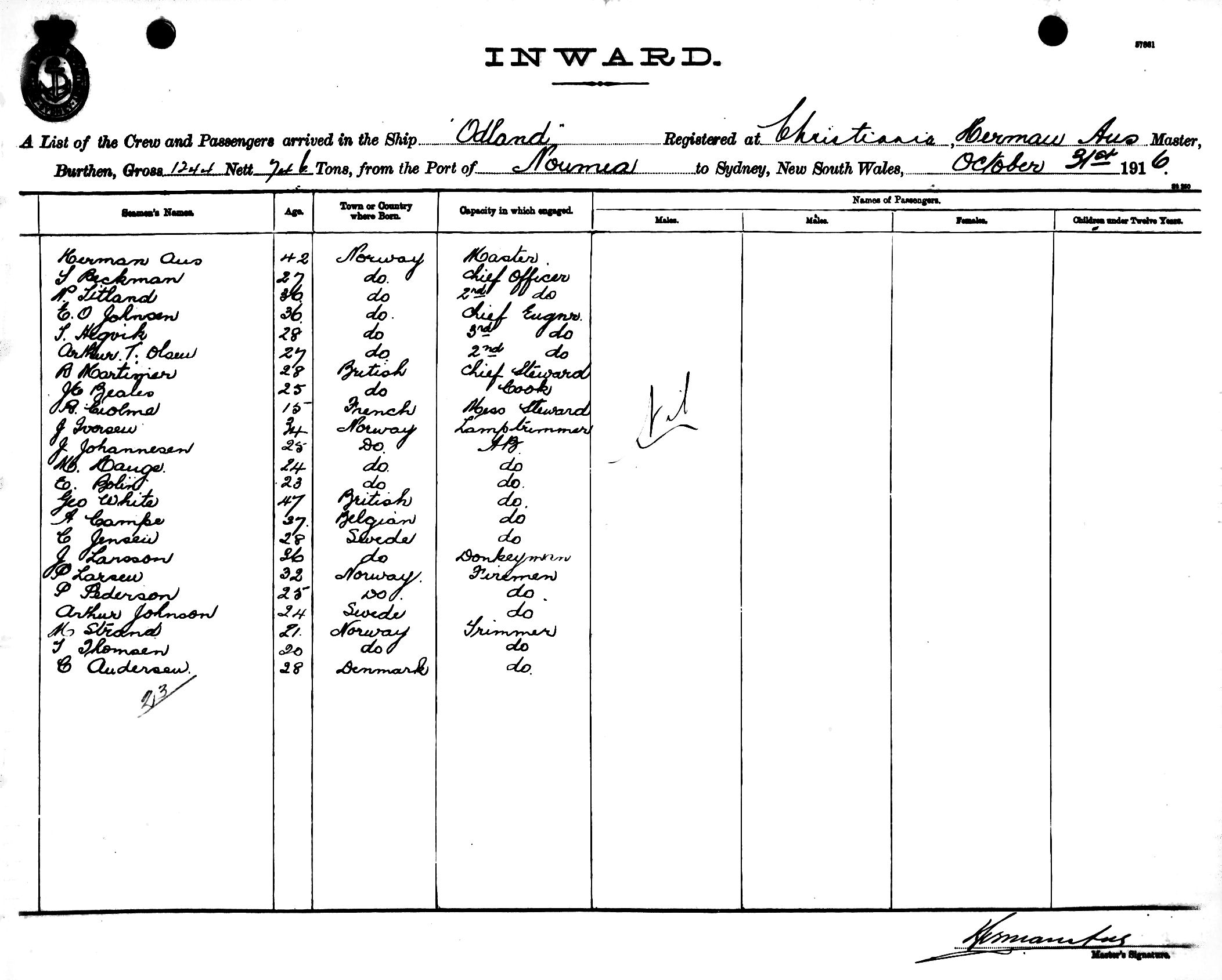 ODLANDOF CHRISTIANIA, HERMAN AUS, MASTER, BURTHEN 1244/746 TONS FROM THE PORT OF NOUMEA TO SYDNEY, NEW SOUTH WALES, 31ST OCTOBER 1916 |