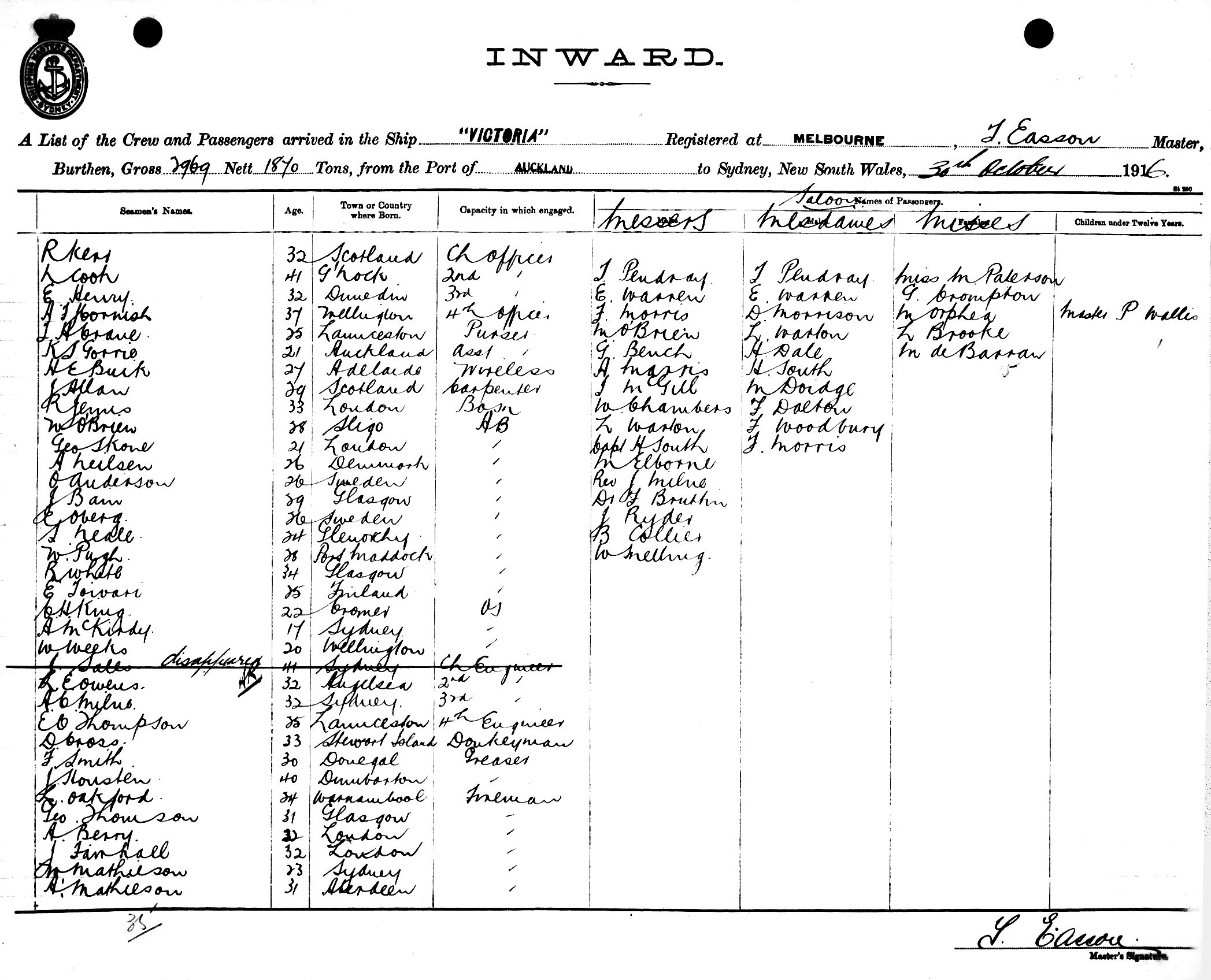 VICTORIAOF MELBOURNE, T. EASSON, MASTER, BURTHEN 2969/1870 TONS FROM THE PORT OF AUCKLAND TO SYDNEY, NEW SOUTH WALES, 30TH OCTOBER 1916 |