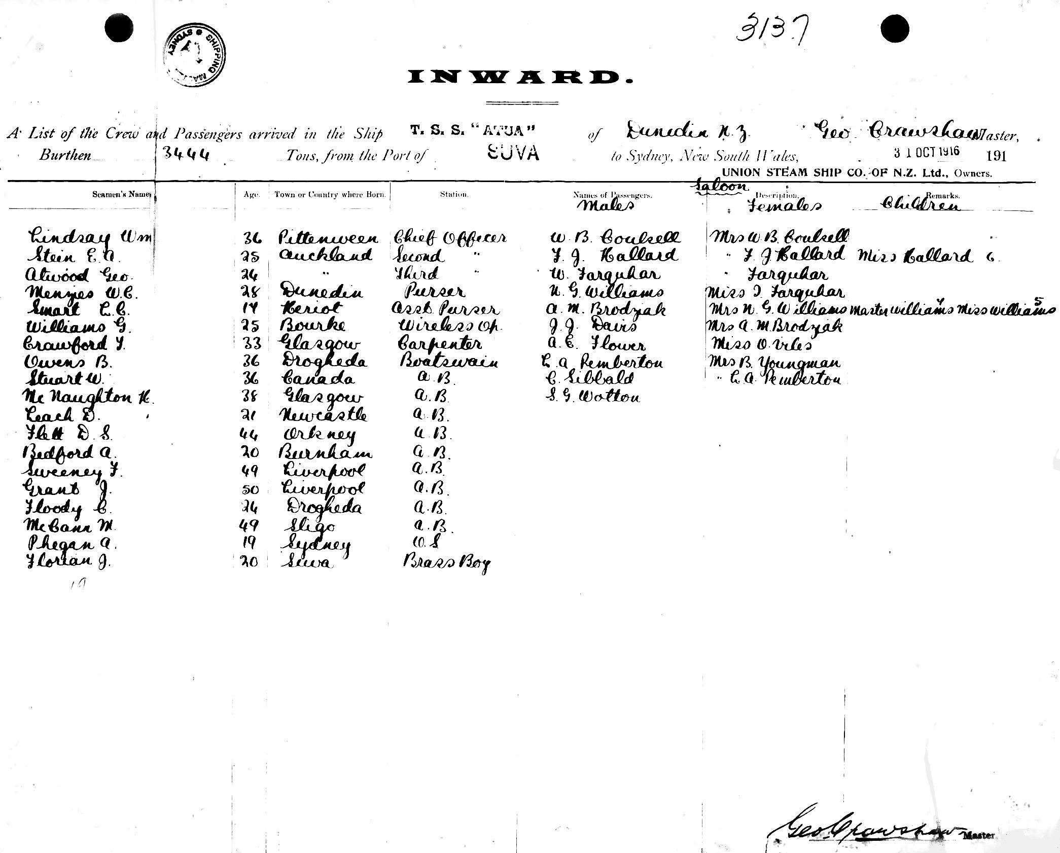 ATUAOF DUNEDIN, GEORGE CRAWSHAW, MASTER, BURTHEN 3444 TONS FROM THE PORT OF SUVA TO SYDNEY, NEW SOUTH WALES, 31ST OCTOBER 1916 |