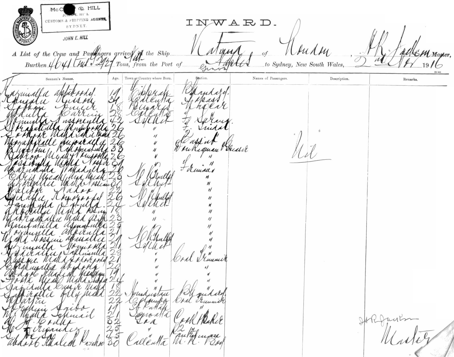 KATUNAOF LONDON, H. R. JACKSON, MASTER, BURTHEN 4641/2927 TONS FROM THE PORTS OF NAPLES & GENOA TO SYDNEY, NEW SOUTH WALES, 2ND NOVEMBER 1916 |