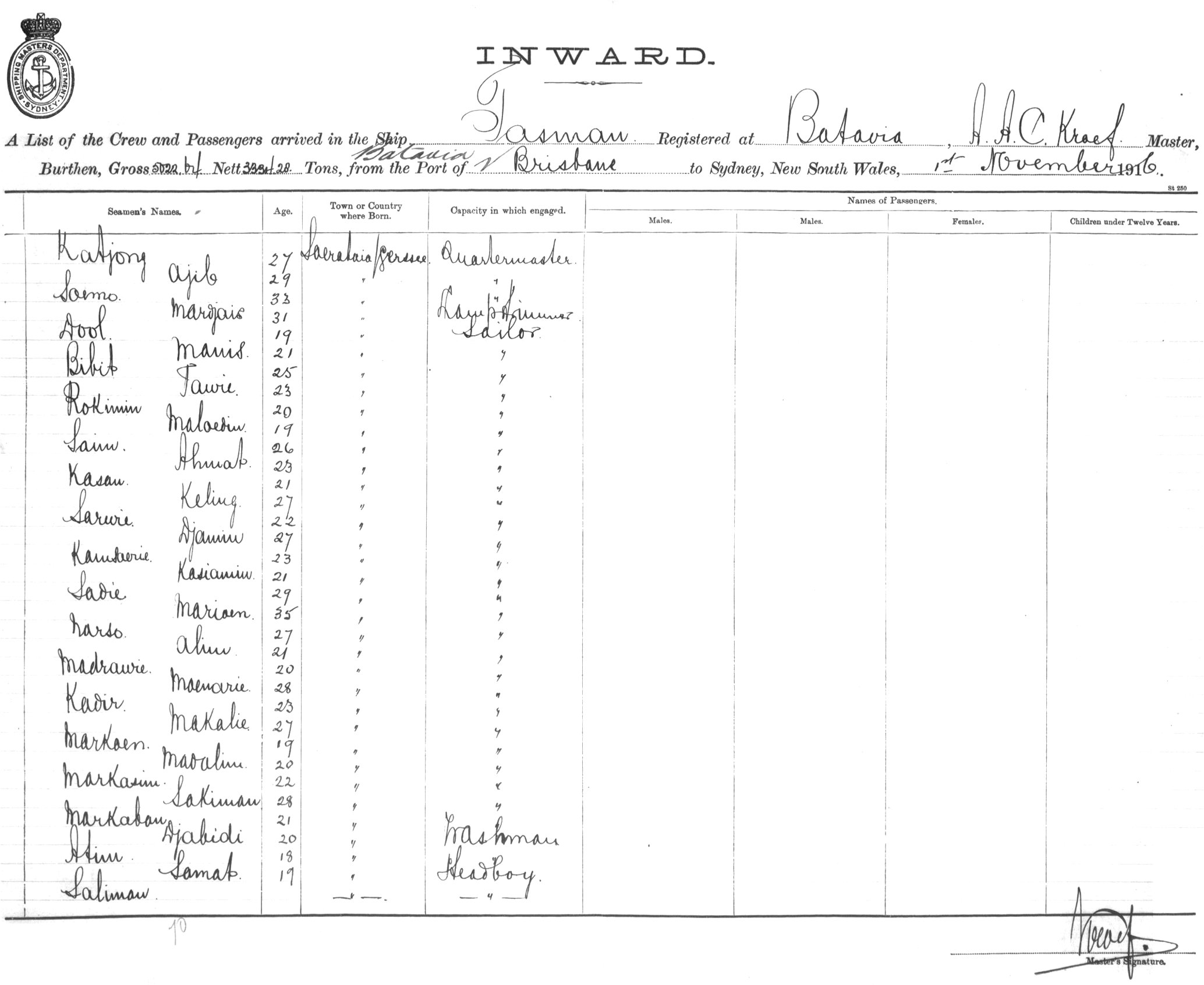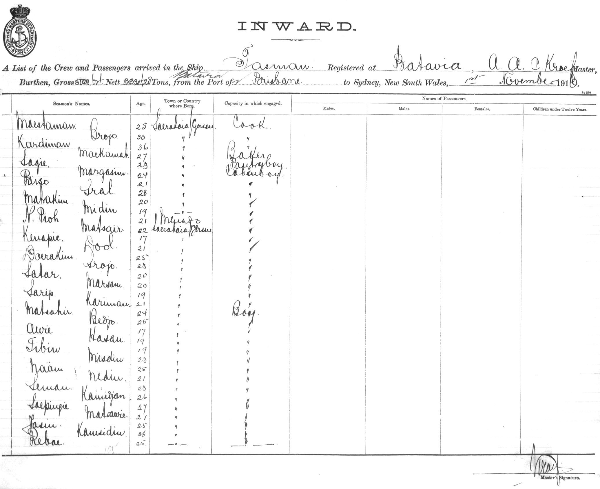 TASMANOF BATAVIA, A.A.C. KROEF, MASTER, BURTHEN 5022/3334 TONS FROM THE PORT OF BATAVIA via BRISBANE TO SYDNEY, NEW SOUTH WALES, 1ST NOVEMBER 1916 |