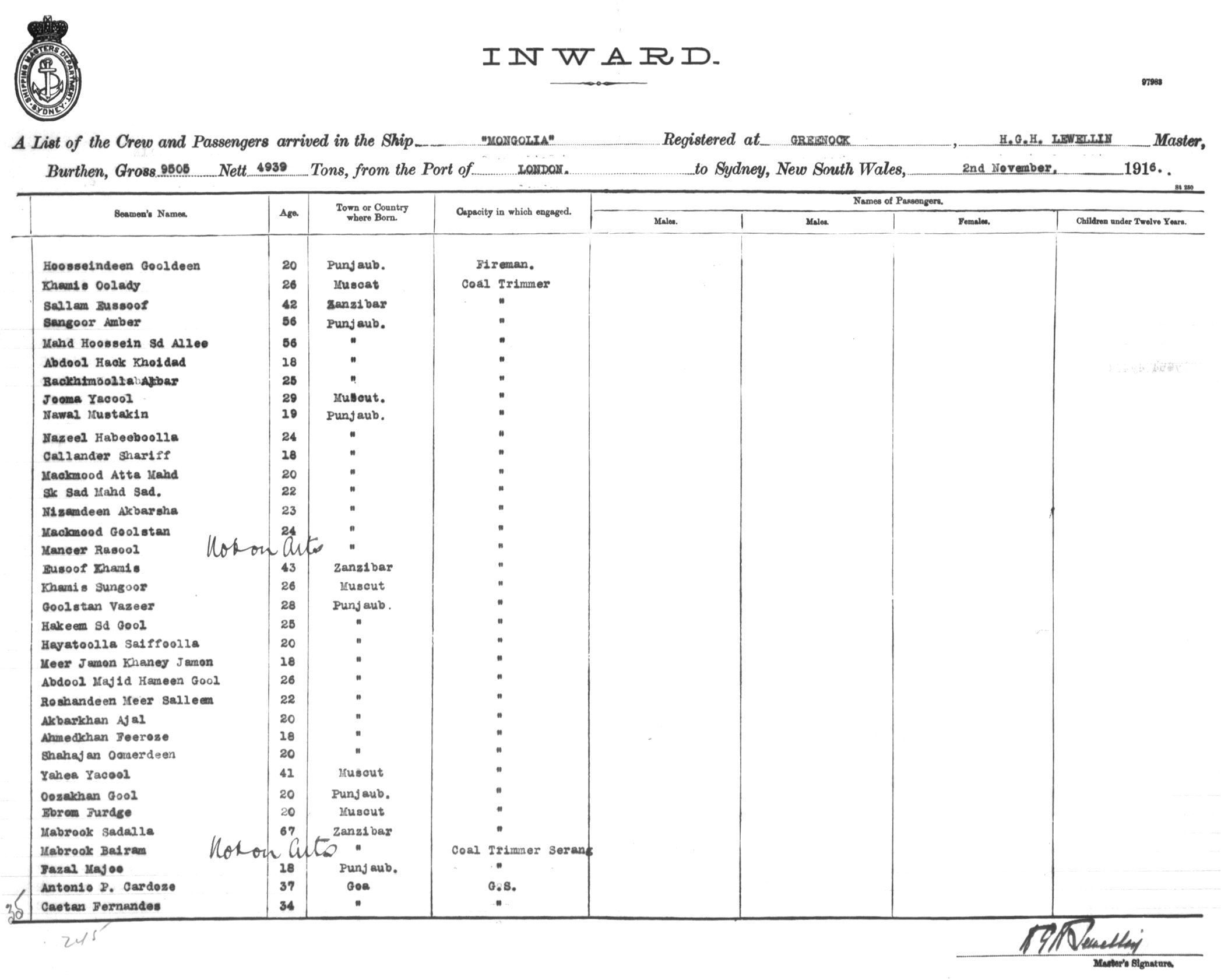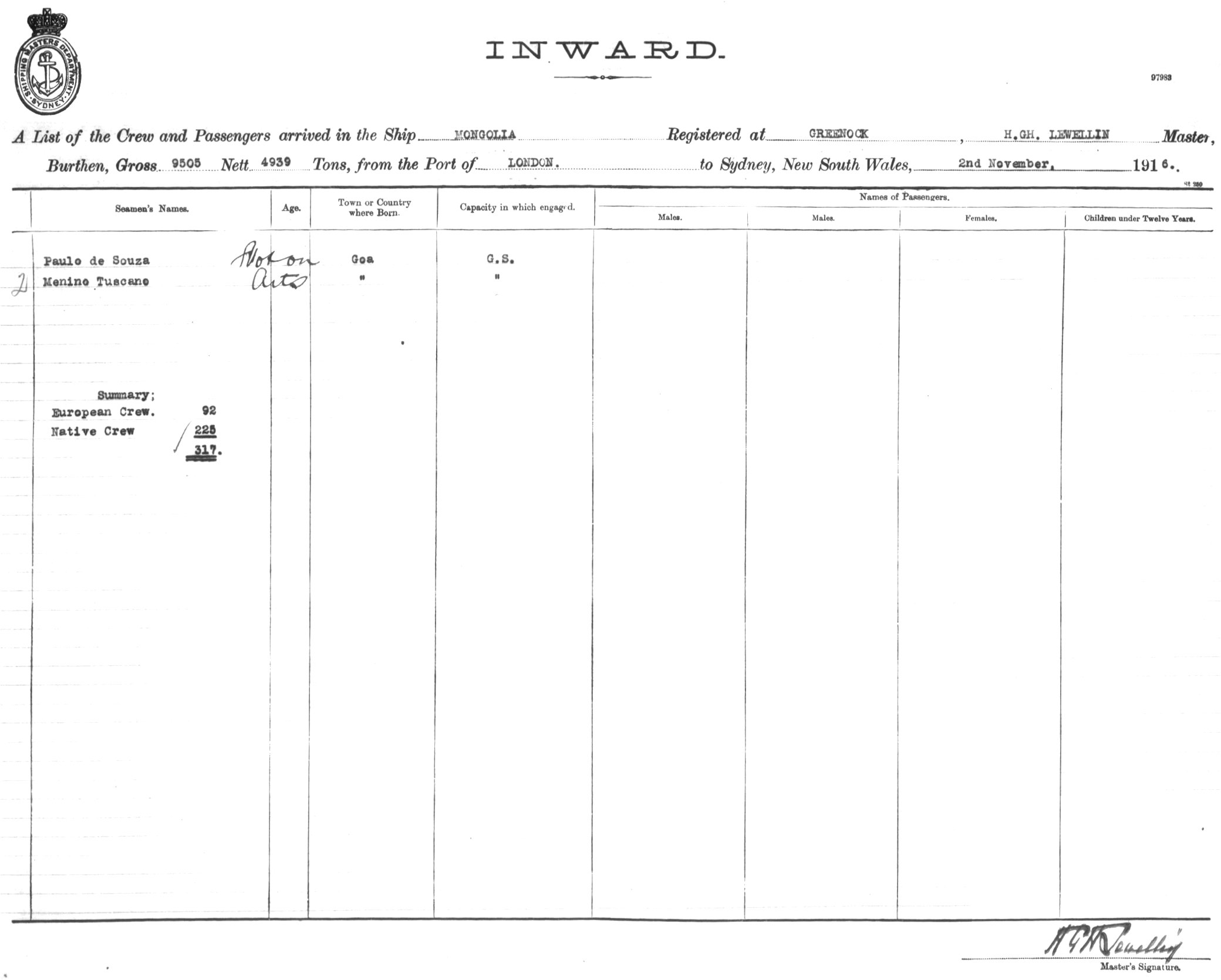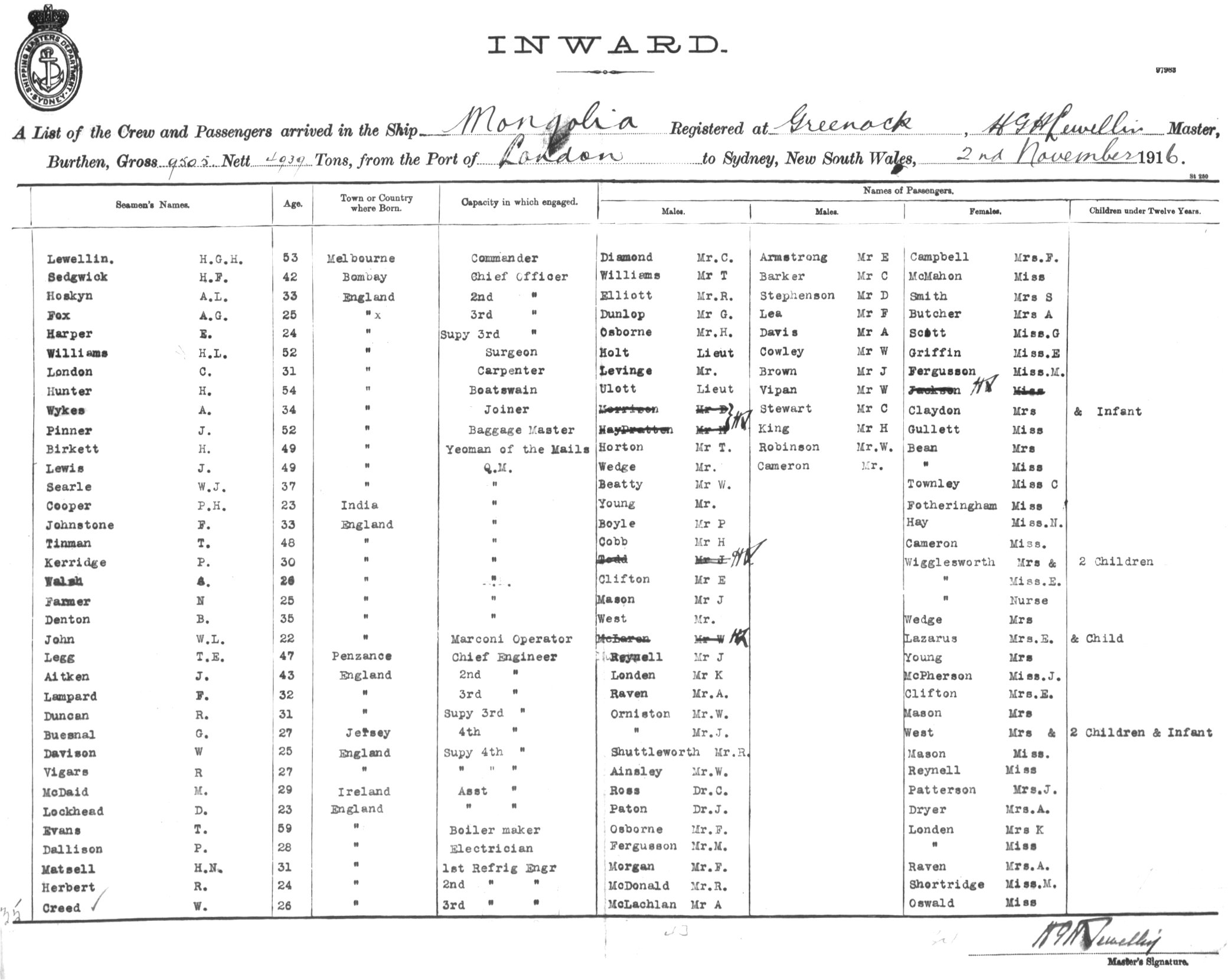OF GREENOCK, H. G. H. LEWELLIN, MASTER, BURTHEN 9505/4939 TONS FROM THE PORT OF LONDON TO SYDNEY, NEW SOUTH WALES, 2ND NOVEMBER 1916