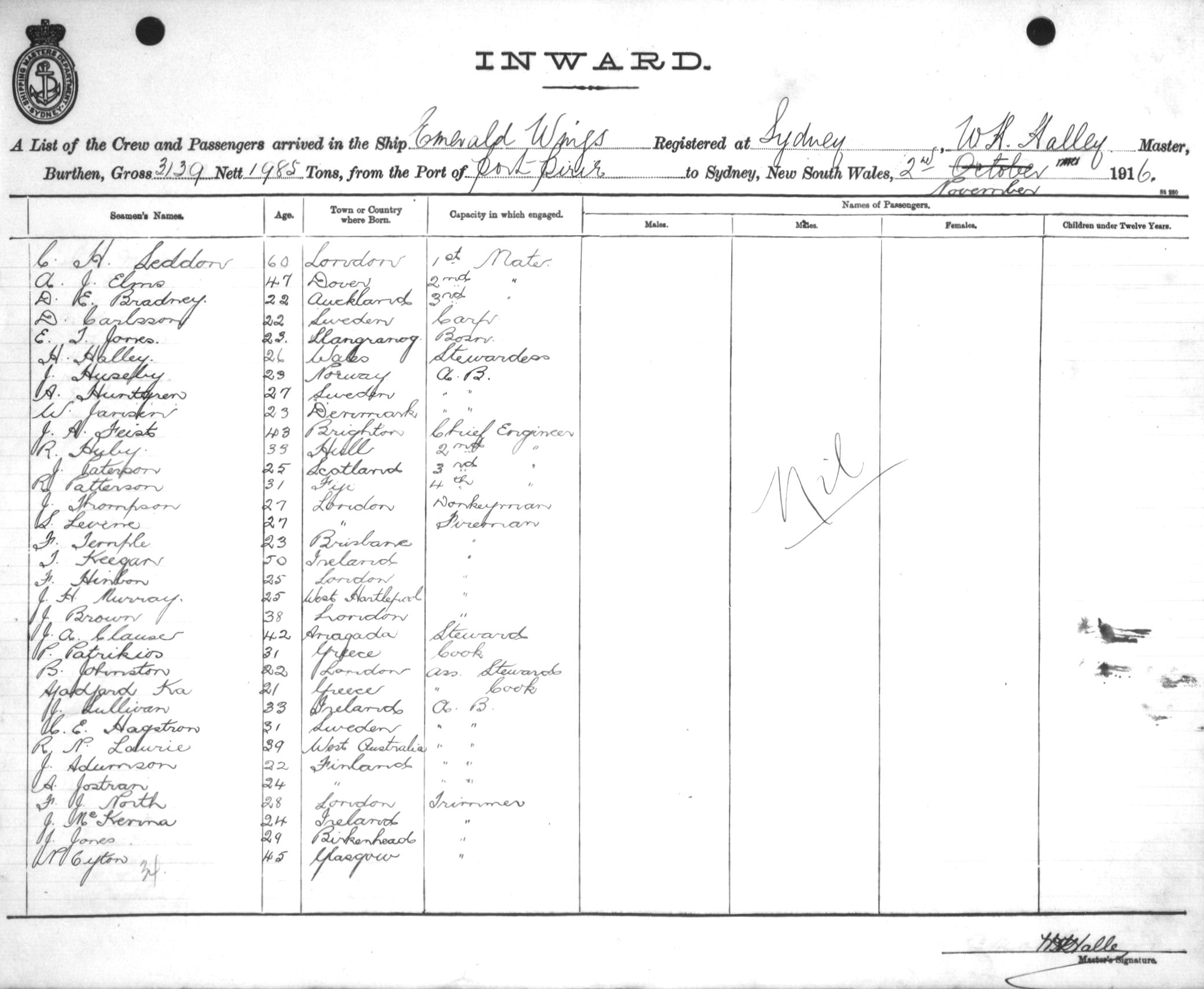 EMERALD WINGSOF SYDNEY, W. H. HALLEY, MASTER, BURTHEN 3139/1985 TONS FROM THE PORT OF PORT PIRIE TO SYDNEY, NEW SOUTH WALES, 2ND NOVEMBER 1916 |