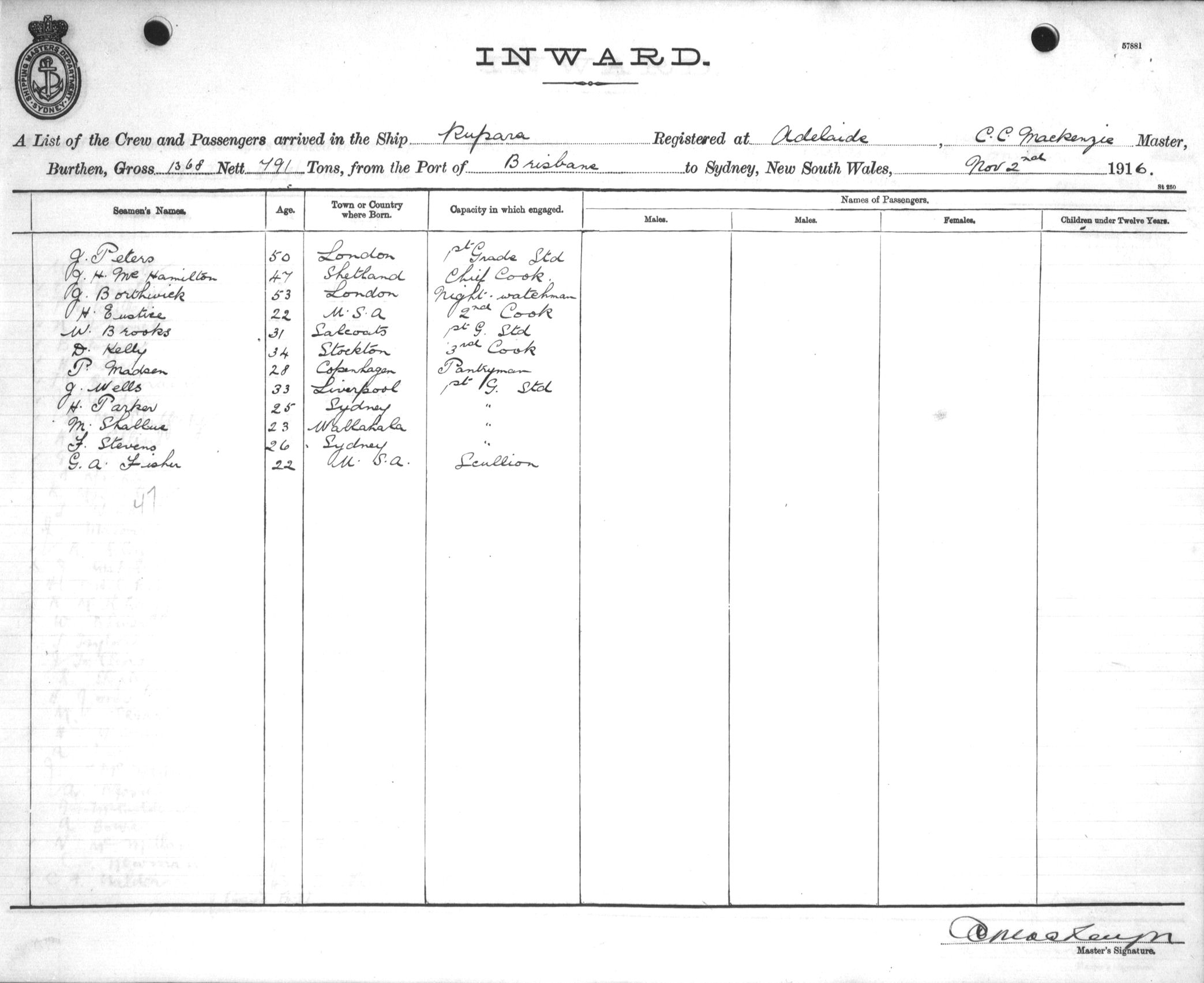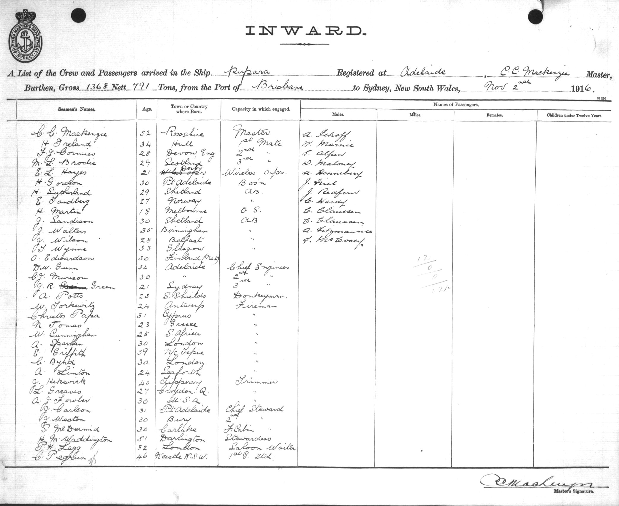 Mariners and ships in Australian Waters | RUPARAOF ADELAIDE, C. C. MACKENZIE, MASTER, BURTHEN 1368/791 TONS FROM THE PORT OF BEISBANE TO SYDNEY, NEW SOUTH WALES, 2ND NOVEMBER 1916 |