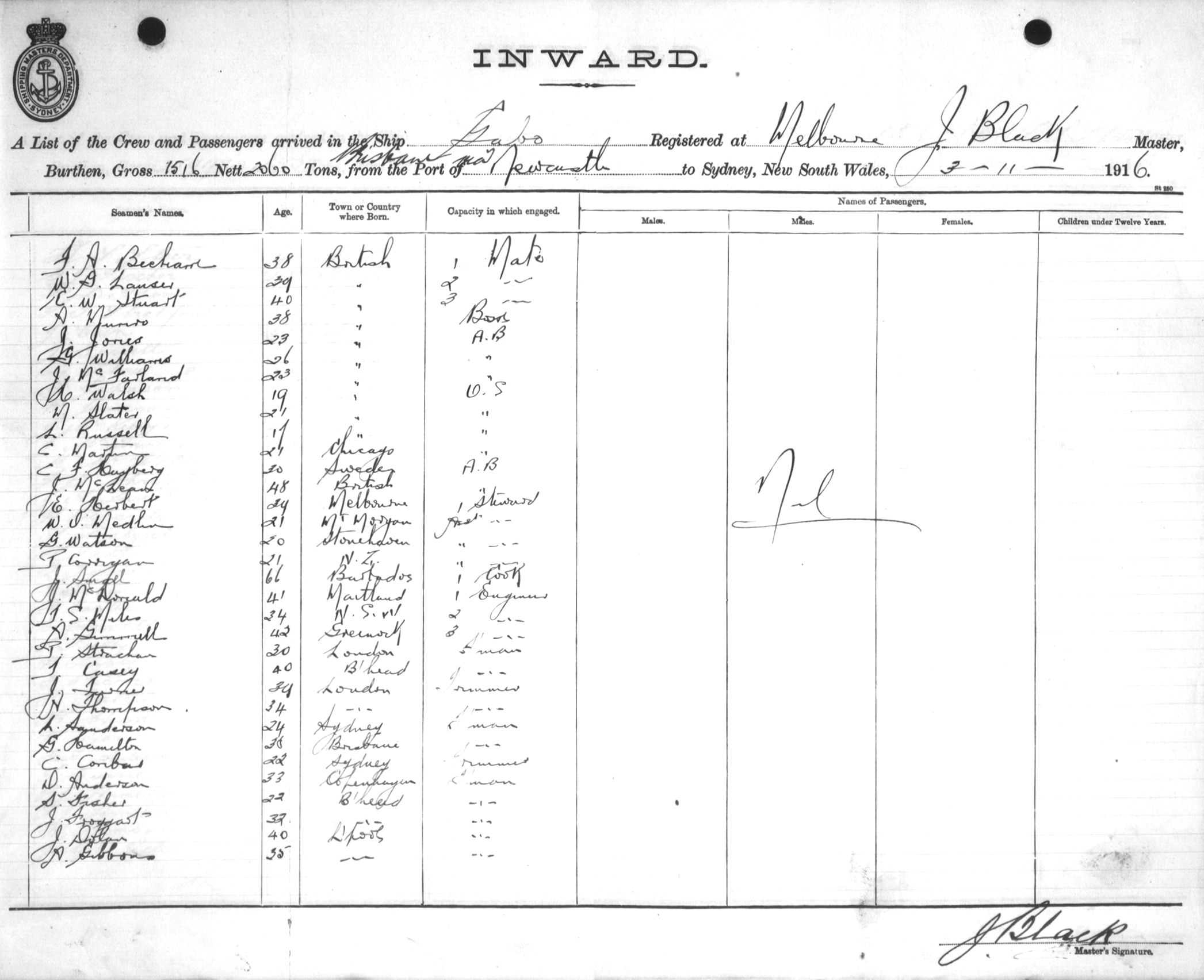 GABOOF MELBOURNE, J. BLACK, MASTER, BURTHEN 2060/1516 TONS FROM THE PORT OF BRISBANE via NEWCASTLE TO SYDNEY, NEW SOUTH WALES, 3RD NOVEMBER 1916 |