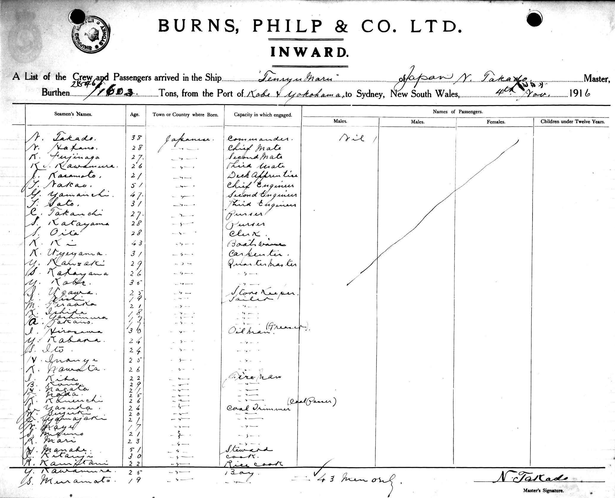 TENRYN MARUOF JAPAN, N. TAKADA, MASTER, BURTHEN 2646/1603 TONS FROM THE PORTS OF KOBE & YOKOHAMA TO SYDNEY, NEW SOUTH WALES, 4TH NOVEMBER 1916 |
